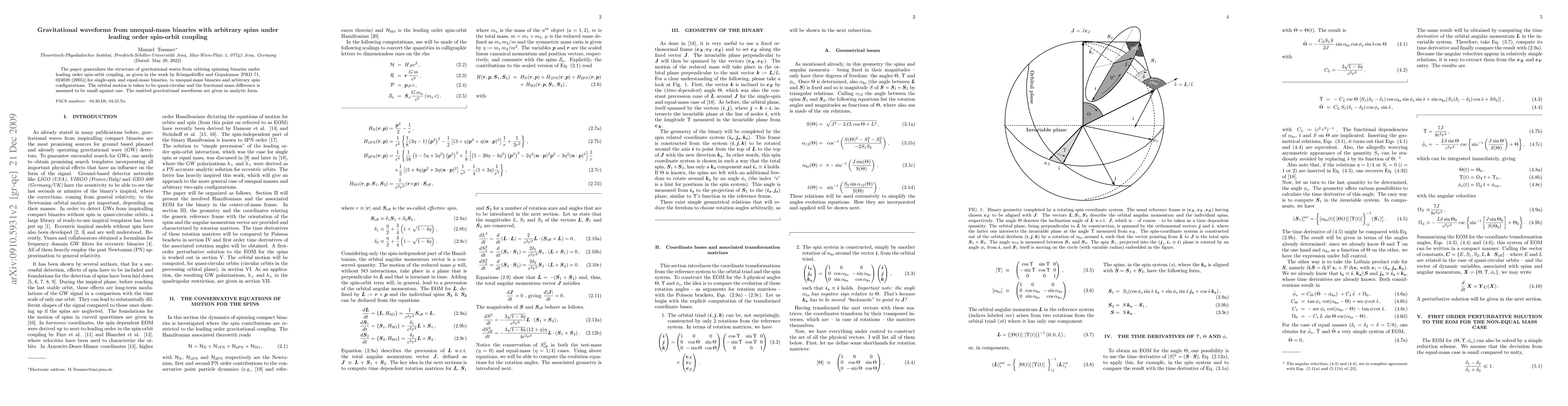 This paper extends the gravitational waveforms for unequal-mass, spinning binary systems under leading order spin-orbit coupling, generalizing previous results for equal-mass, single-spin binaries. The study provides analytic expressions for the emitted waveforms, assuming quasi-circular orbits and small mass differences.