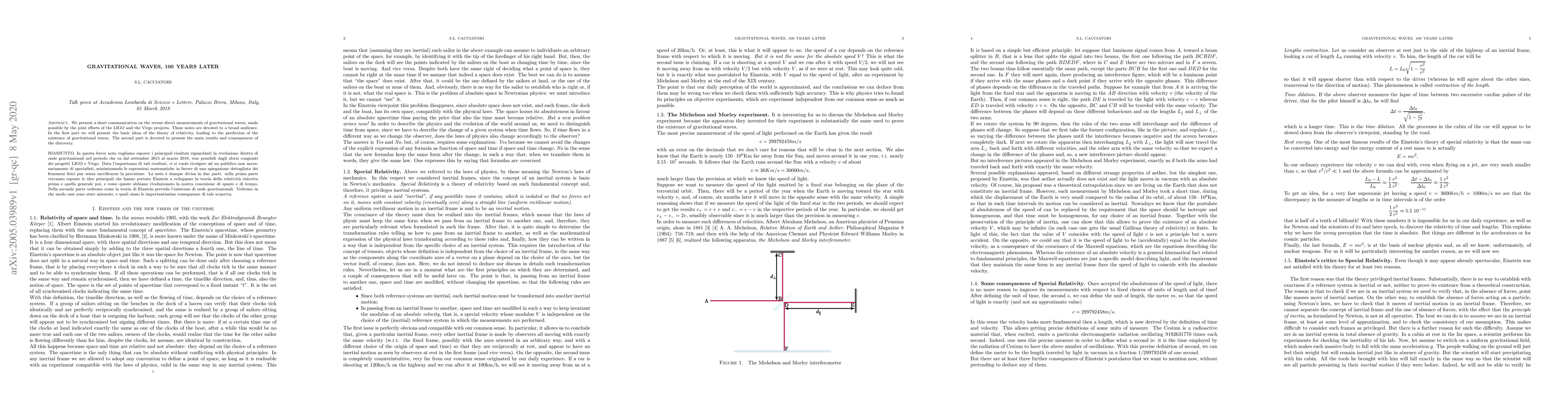 We present a short communication on the recent direct measurements of gravitational waves, made possible by the joint efforts of the LIGO and the Virgo projects. These notes are devoted to a broad audience. In the first part we will present the basic ideas of the theory of relativity, leading to the prediction of the existence of gravitational waves. The second part is devoted to present the main results and consequences of the discovery.