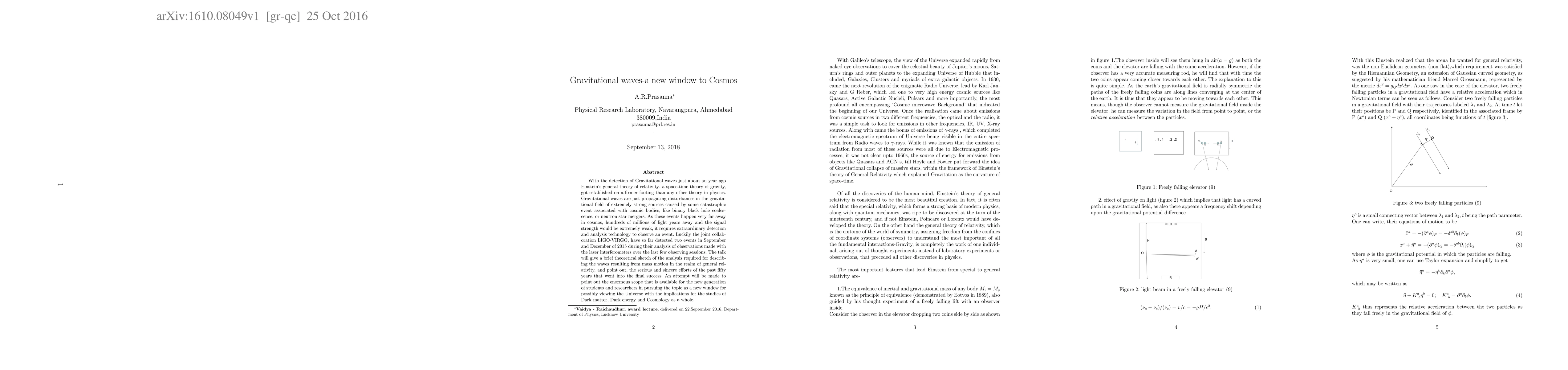 With the detection of Gravitational waves just about an year ago Einstein`s general theory of relativity- a space-time theory of gravity, got established on a firmer footing than any other theory in physics. Gravitational waves are just propagating disturbances in the gravitational field of extremely strong sources caused by some catastrophic event associated with cosmic bodies, like binary black hole coalescence, or neutron star mergers. As these events happen very far away in cosmos, and the signal strength would be extremely weak, it requires extraordinary detection and analysis technology to observe an event on earth. Luckily the joint collaboration LIGO-VIRGO, have so far detected two events in September and December of 2015 during their analysis of observations made with the laser interferometers over the last few observing sessions. The talk will give a brief theoretical sketch of the analysis required for describing the waves resulting from mass motion in the realm of general relativity, and point out, the serious and sincere efforts of the past fifty years that went into the final success. An attempt will be made to point out the enormous scope that is available for the new generation of students and researchers in pursuing the topic as a new window for possibly viewing the Universe with the implications for the studies of Dark matter, Dark energy and Cosmology as a whole.