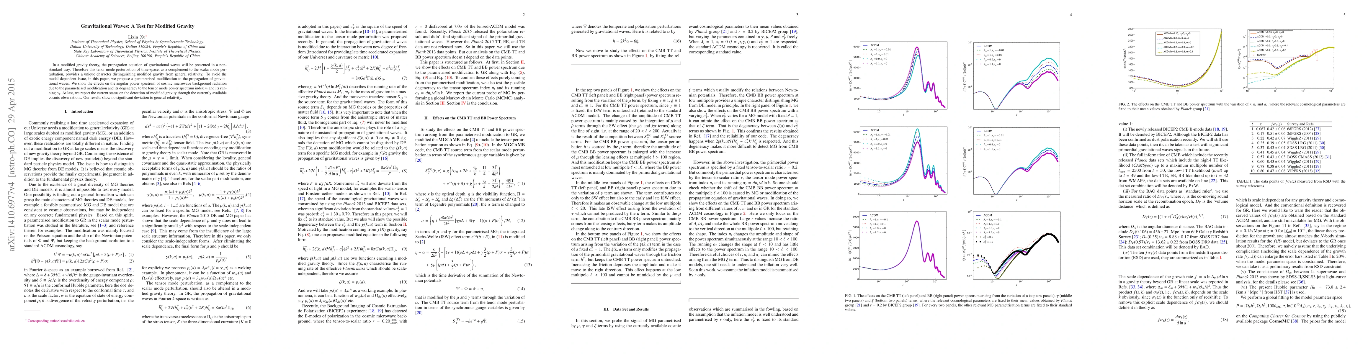 In a modified gravity theory, the propagation equation of gravitational waves will be presented in a non-standard way. Therefore this tenor mode perturbation of time-space, as a complement to the scalar mode perturbation, provides a unique character distinguishing modified gravity from general relativity. To avoid the model-dependent issue, in this paper, we propose a parametrised modification to the propagation of gravitational waves. We show the effects on the angular power spectrum of cosmic microwave background radiation due to the parametrised modification and its degeneracy to the tensor mode power spectrum index $n_t$ and its running $\alpha_t$. At last, we report the current status on the detection of modified gravity through the currently available cosmic observations. Our results show no significant deviation to general relativity.