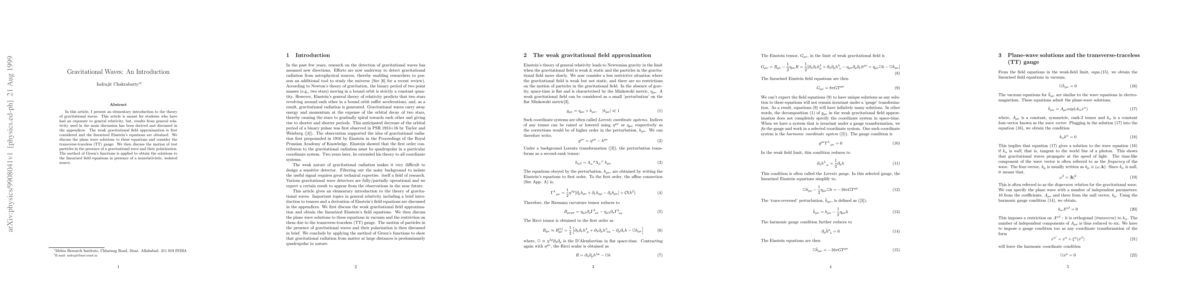 This paper introduces gravitational waves, focusing on the weak field approximation and plane wave solutions, providing a foundation for understanding this phenomenon in general relativity. It also explores test particle motion and polarization in the presence of gravitational waves using Green's function methods.