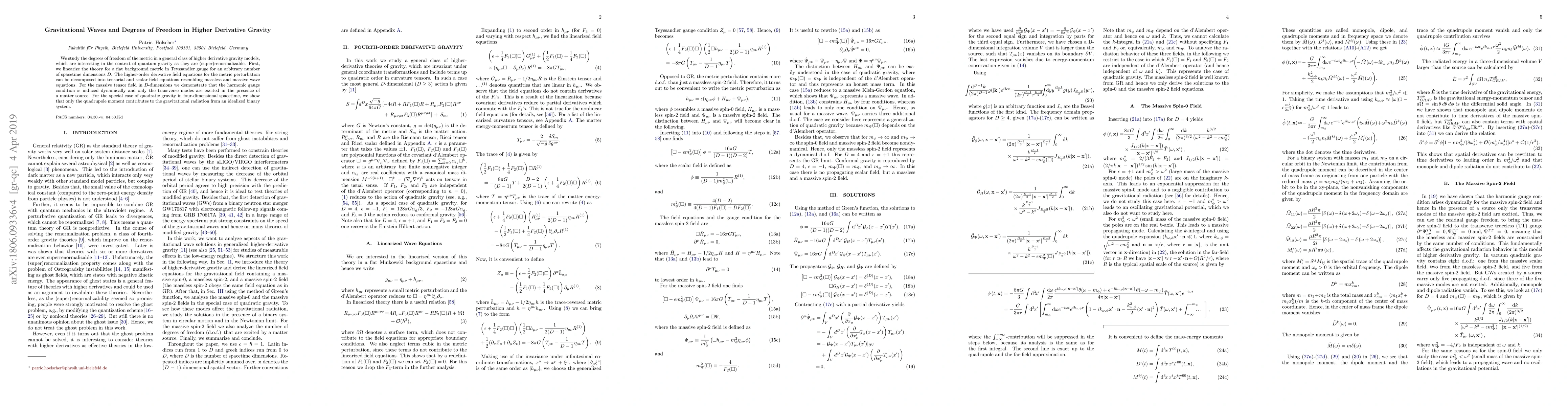 This paper investigates the degrees of freedom in higher derivative gravity models, demonstrating that only transverse modes are excited for massive tensor fields in the presence of a matter source. It concludes that in quadratic gravity, only the quadrupole moment contributes to gravitational radiation from binary systems.