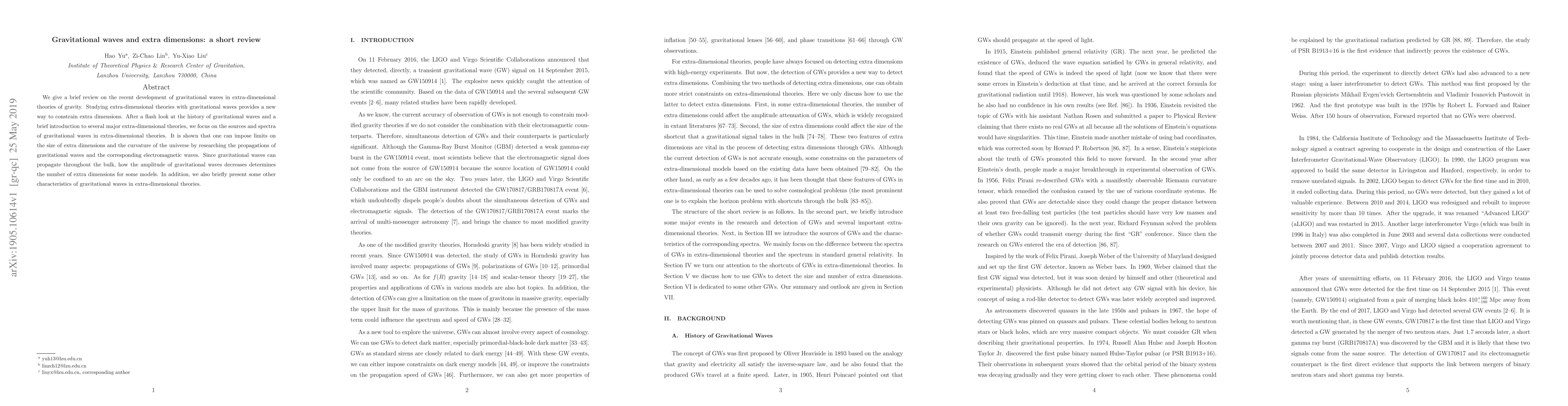 The paper provides a concise review of gravitational waves in extra-dimensional theories, focusing on sources, spectra, and shortcuts of gravitational waves.