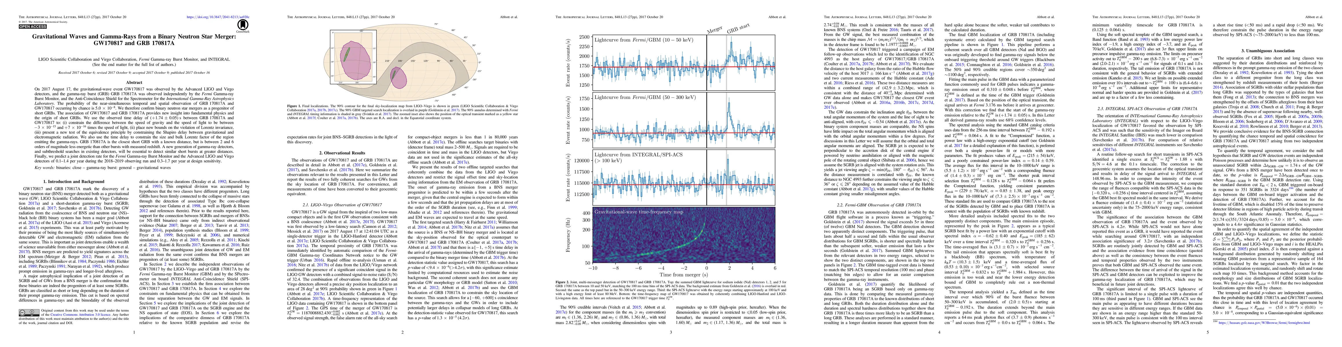 This paper confirms binary neutron star mergers as the progenitor of short gamma-ray bursts (GRBs) by observing the simultaneous detection of GW170817 and GRB 170817A, providing insights into fundamental physics and the origin of short GRBs. The time delay between the events also constrains the speed of gravity, Lorentz invariance, and the equivalence principle.
