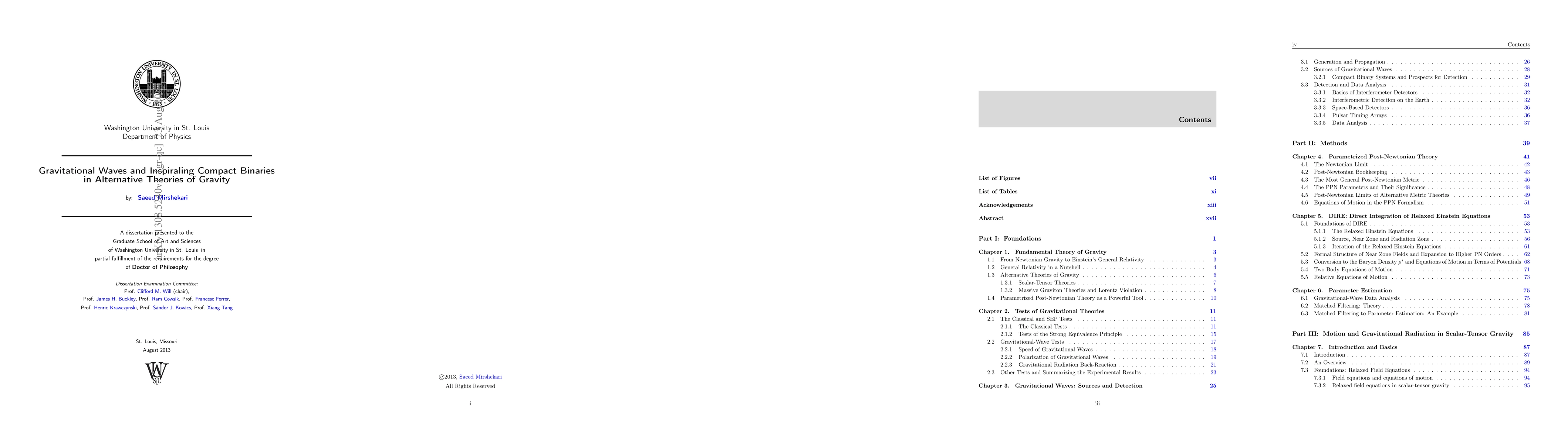 This paper reviews fundamental theories of gravity and experimental tests, and develops methods for calculating gravitational waves in alternative theories. It calculates the motion of compact binaries in scalar-tensor theories and finds their behavior is observationally identical to general relativity predictions. It also explores the impact of Lorentz invariance violations on gravitational wave propagation and proposes a framework for constraining such deviations.