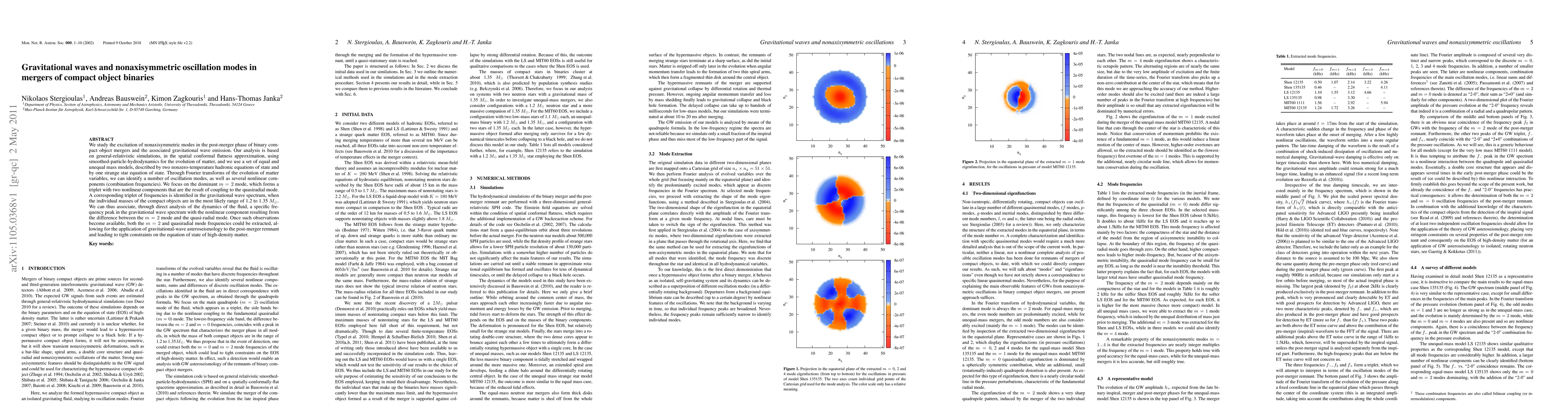 We study the excitation of nonaxisymmetric modes in the post-merger phase of binary compact object mergers and the associated gravitational wave emission. Our analysis is based on general-relativistic simulations, in the spatial conformal flatness approximation, using smoothed-particle-hydrodynamics for the evolution of matter, and we use a set of equal and unequal mass models, described by two nonzero-temperature hadronic equations of state and by one strange star equation of state. Through Fourier transforms of the evolution of matter variables, we can identify a number of oscillation modes, as well as several nonlinear components (combination frequencies). We focus on the dominant m=2 mode, which forms a triplet with two nonlinear components that are the result of coupling to the quasiradial mode. A corresponding triplet of frequencies is identified in the gravitational wave spectrum, when the individual masses of the compact objects are in the most likely range of 1.2 to 1.35 $M_\odot$. We can thus associate, through direct analysis of the dynamics of the fluid, a specific frequency peak in the gravitational wave spectrum with the nonlinear component resulting from the difference between the m=2 mode and the quasiradial mode. Once such observations become available, both the m=2 and quasiradial mode frequencies could be extracted, allowing for the application of gravitational-wave asteroseismology to the post-merger remnant and leading to tight constraints on the equation of state of high-density matter.