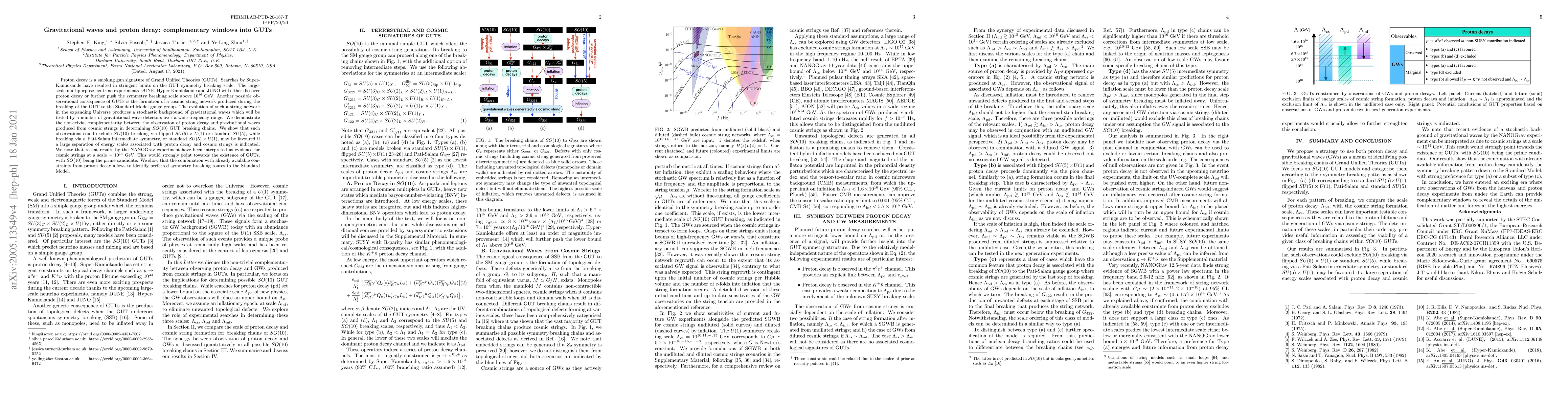 This paper investigates the complementary roles of proton decay and gravitational waves from cosmic strings in probing Grand Unified Theories (GUTs). It concludes that the observation of either phenomenon can significantly constrain GUT symmetry breaking scales, potentially favoring certain breaking chains over others.