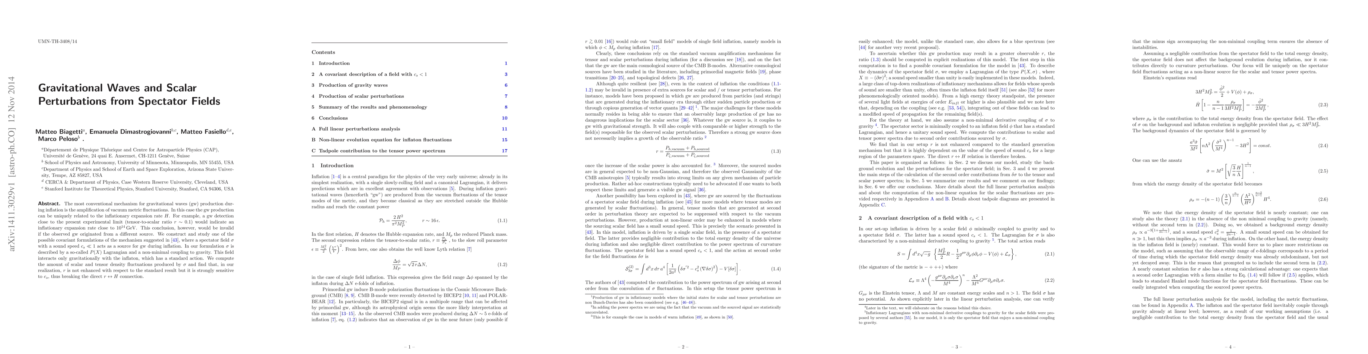 The most conventional mechanism for gravitational waves (gw) production during inflation is the amplification of vacuum metric fluctuations. In this case the gw production can be uniquely related to the inflationary expansion rate $H$. For example, a gw detection close to the present experimental limit (tensor-to-scalar ratio $r \sim 0.1$) would indicate an inflationary expansion rate close to $10^{14} \, {\rm GeV}$. This conclusion, however, would be invalid if the observed gw originated from a different source. We construct and study one of the possible covariant formulations of the mechanism suggested in [43], where a spectator field $\sigma$ with a sound speed $c_{s} \ll 1$ acts as a source for gw during inflation. In our formulation $\sigma$ is described by a so-called $P(X)$ Lagrangian and a non-minimal coupling to gravity. This field interacts only gravitationally with the inflaton, which has a standard action. We compute the amount of scalar and tensor density fluctuations produced by $\sigma$ and find that, in our realization, $r$ is not enhanced with respect to the standard result but it is strongly sensitive to $c_s$, thus breaking the direct $r \leftrightarrow H$ connection.