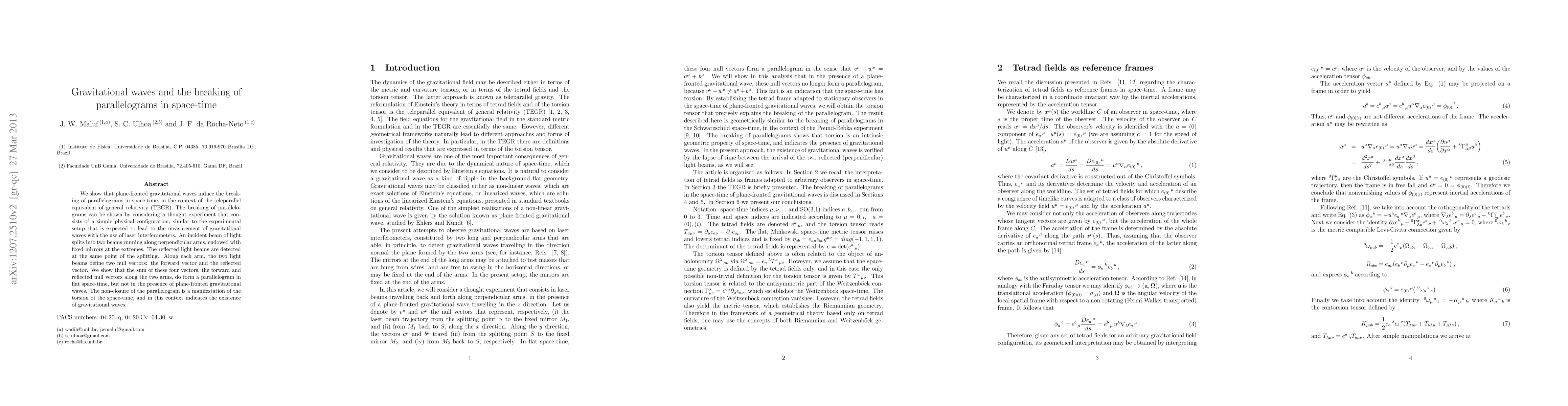 This paper demonstrates that plane-fronted gravitational waves cause the breaking of parallelograms in space-time within the framework of the teleparallel equivalent of general relativity (TEGR). The study uses a thought experiment involving laser interferometers to show that the sum of forward and reflected light vectors no longer forms a parallelogram in the presence of gravitational waves, indicating space-time torsion.