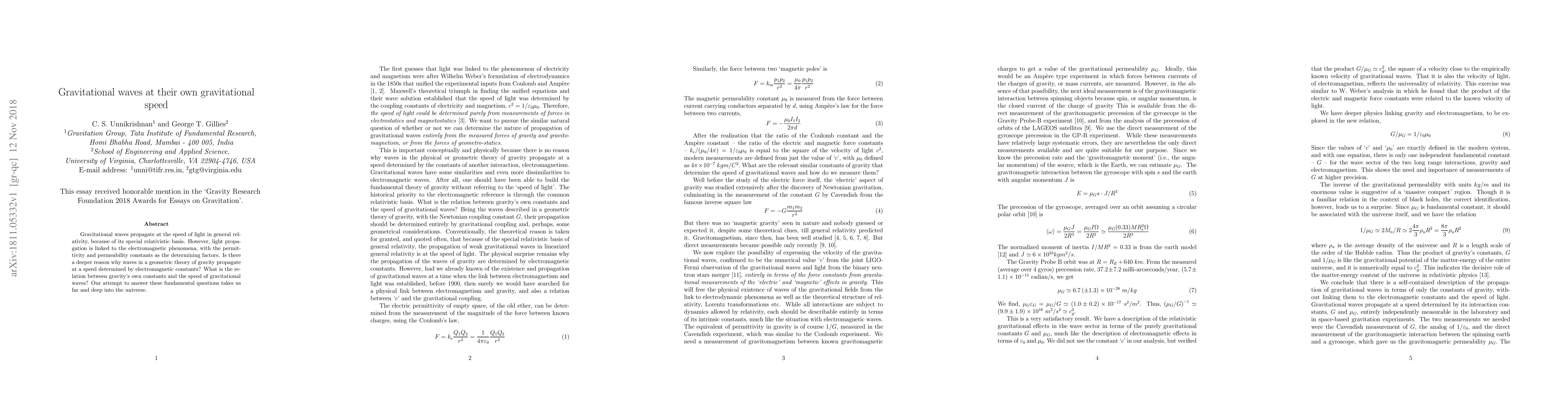 Gravitational waves propagate at the speed of light in general relativity, because of its special relativistic basis. However, light propagation is linked to the electromagnetic phenomena, with the permittivity and permeability constants as the determining factors. Is there a deeper reason why waves in a geometric theory of gravity propagate at a speed determined by electromagnetic constants? What is the relation between gravity's own constants and the speed of gravitational waves? Our attempt to answer these fundamental questions takes us far and deep into the universe.