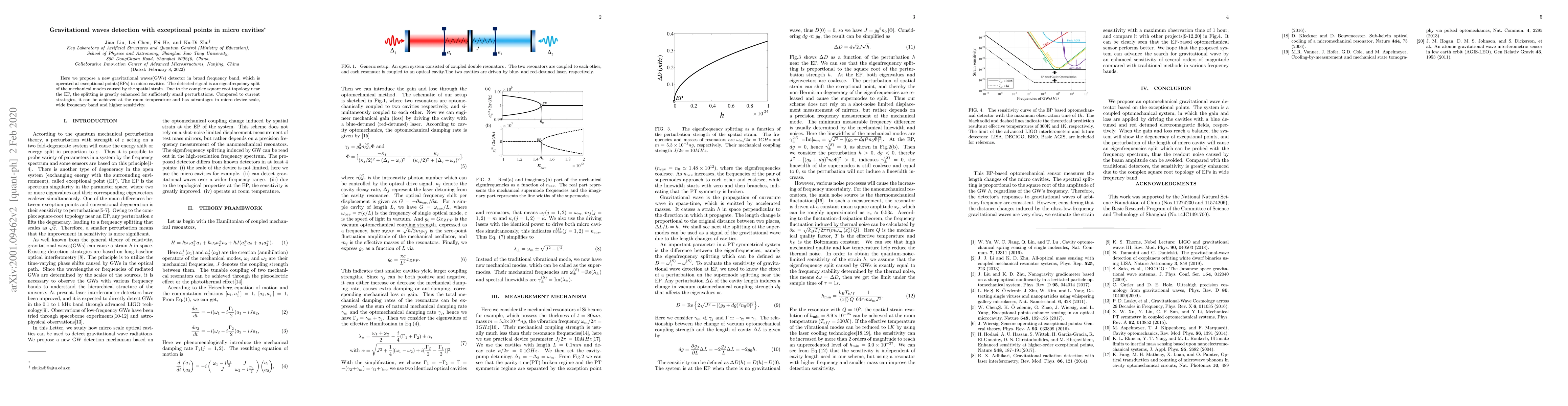 This paper proposes a novel gravitational wave detector using exceptional points in micro cavities, which enhances eigenfrequency splitting due to spatial strain, offering higher sensitivity, micro device scale, and operation at room temperature compared to current methods.