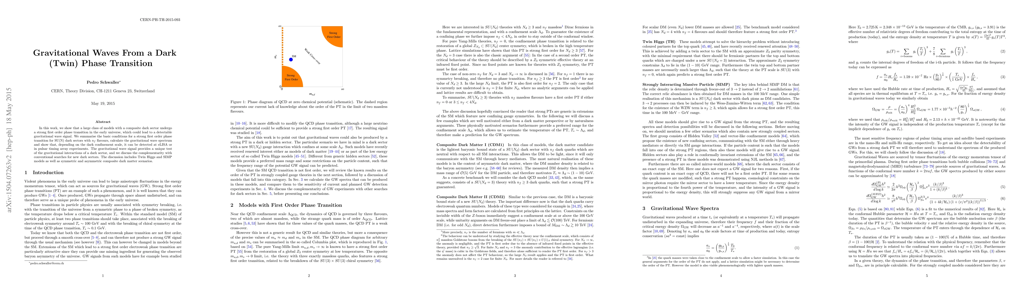 In this work, we show that a large class of models with a composite dark sector undergo a strong first order phase transition in the early universe, which could lead to a detectable gravitational wave signal. We summarise the basic conditions for a strong first order phase transition for SU(N) dark sectors with n_f flavours, calculate the gravitational wave spectrum and show that, depending on the dark confinement scale, it can be detected at eLISA or in pulsar timing array experiments. The gravitational wave signal provides a unique test of the gravitational interactions of a dark sector, and we discuss the complementarity with conventional searches for new dark sectors. The discussion includes Twin Higgs and SIMP models as well as symmetric and asymmetric composite dark matter scenarios.