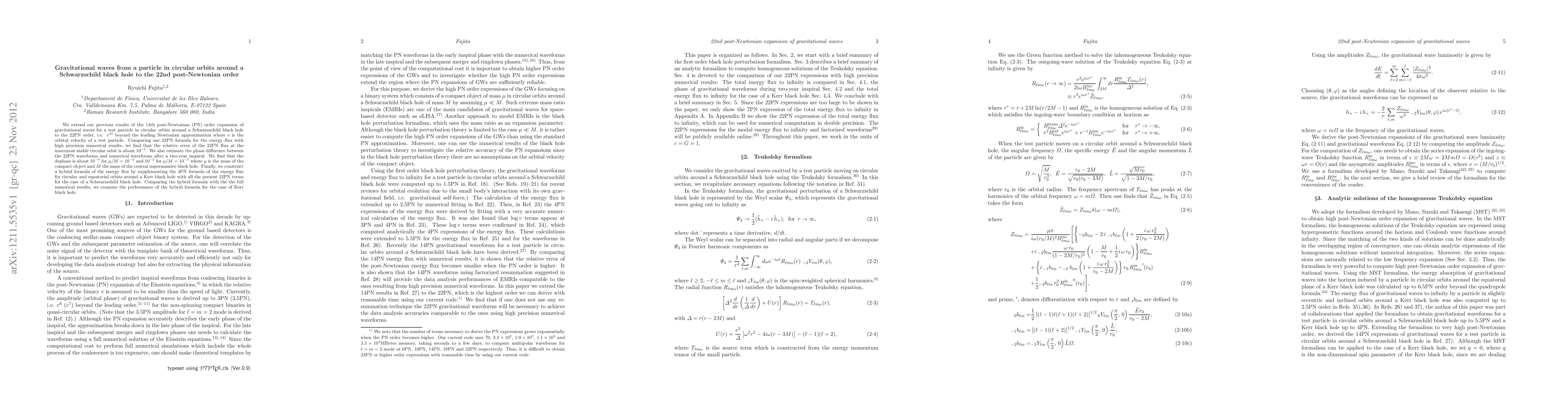 This paper extends the post-Newtonian expansion of gravitational waves from a test particle in circular orbit around a Schwarzschild black hole to the 22nd order, achieving a relative error of $10^{-5}$ in energy flux. The study also estimates the phase difference between 22PN waveforms and numerical results, finding dephases of $10^{-9}$ and $10^{-2}$ for different mass ratios.