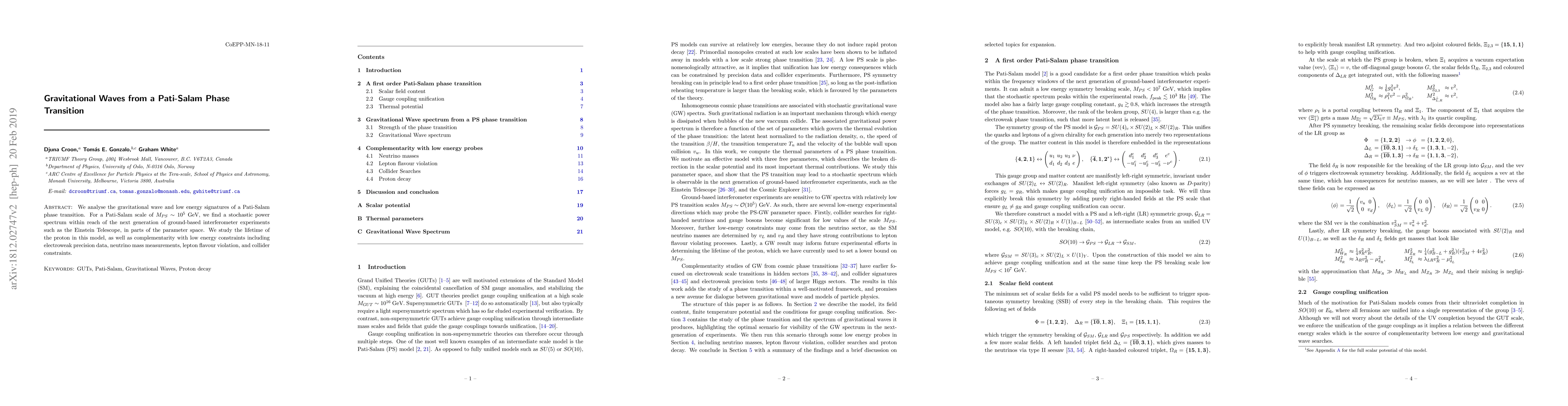 We analyse the gravitational wave and low energy signatures of a Pati-Salam phase transition. For a Pati-Salam scale of $M_{PS} \sim 10^5$ GeV, we find a stochastic power spectrum within reach of the next generation of ground-based interferometer experiments such as the Einstein Telescope, in parts of the parameter space. We study the lifetime of the proton in this model, as well as complementarity with low energy constraints including electroweak precision data, neutrino mass measurements, lepton flavour violation, and collider constraints.