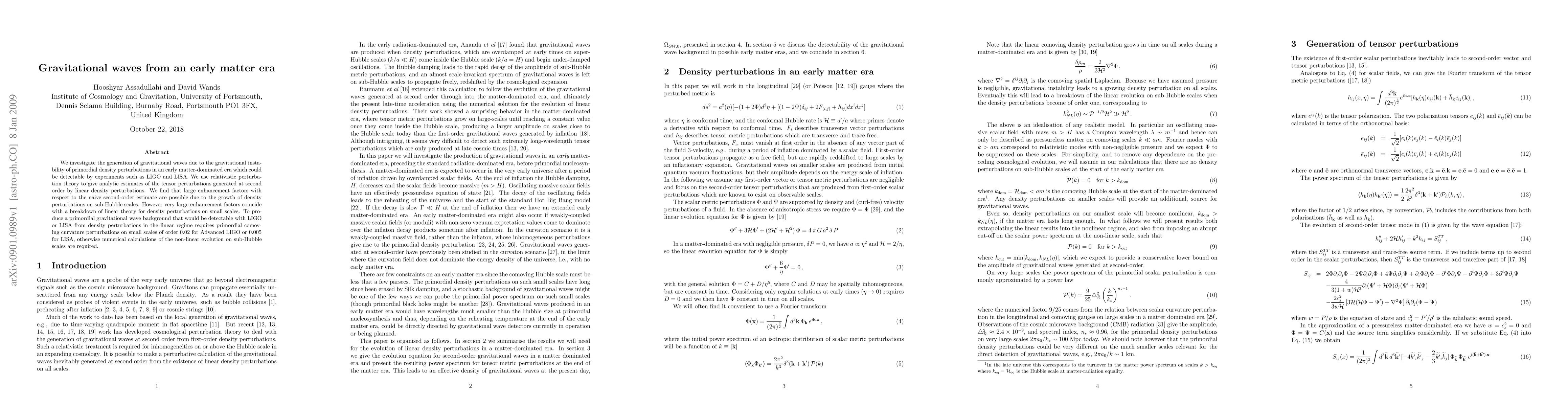 Gravitational waves from early matter era are estimated using relativistic perturbation theory, with large enhancement factors possible due to sub-Hubble scale growth of density perturbations. Detectability requires primordial curvature perturbations on small scales.