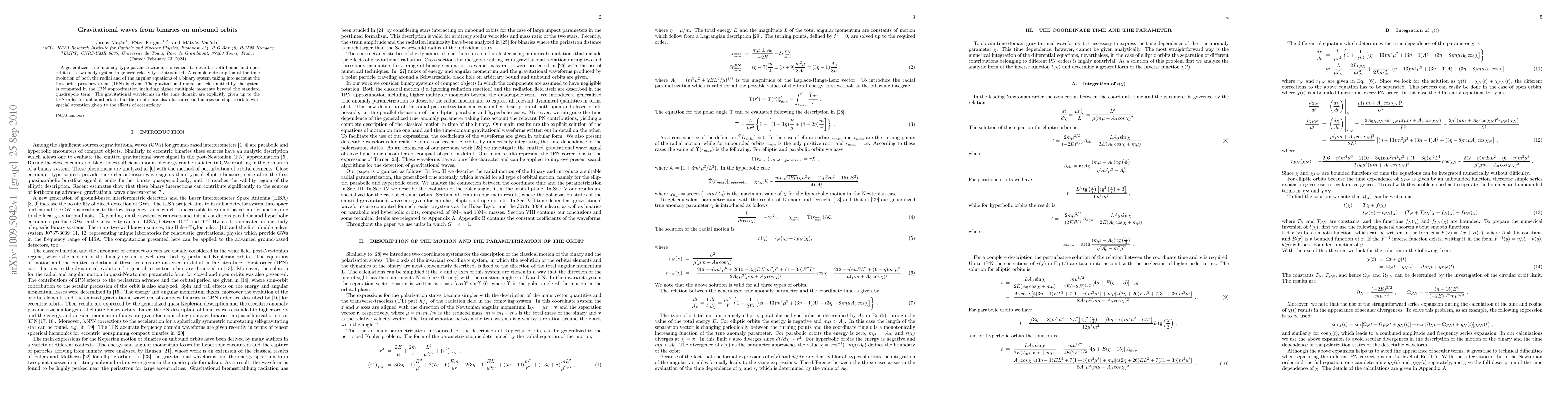 A generalized true anomaly-type parametrization, convenient to describe both bound and open orbits of a two-body system in general relativity is introduced. A complete description of the time evolution of both the radial and of the angular equations of a binary system taking into account the first order post-newtonian (1PN) is given. The gravitational radiation field emitted by the system is computed in the 1PN approximation including higher multipole moments beyond the standard quadrupole term. The gravitational waveforms in the time domain are explicitly given up to the 1PN order for unbound orbits, but the results are also illustrated on binaries on elliptic orbits with special attention given to the effects of eccentricity.