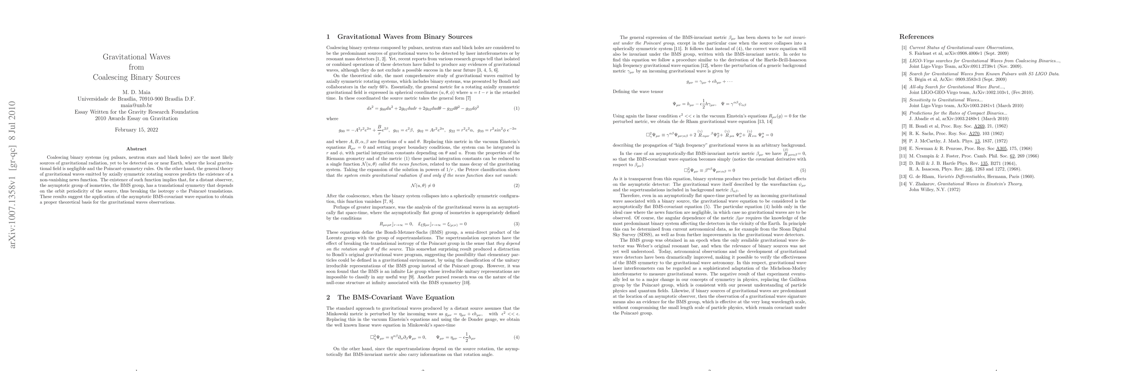 This paper discusses the gravitational waves emitted by coalescing binary systems like pulsars, neutron stars, and black holes, highlighting their potential detection on Earth. It explores the implications of these waves on the BMS group, suggesting a theoretical framework based on the asymptotic BMS-covariant wave equation for future observations.