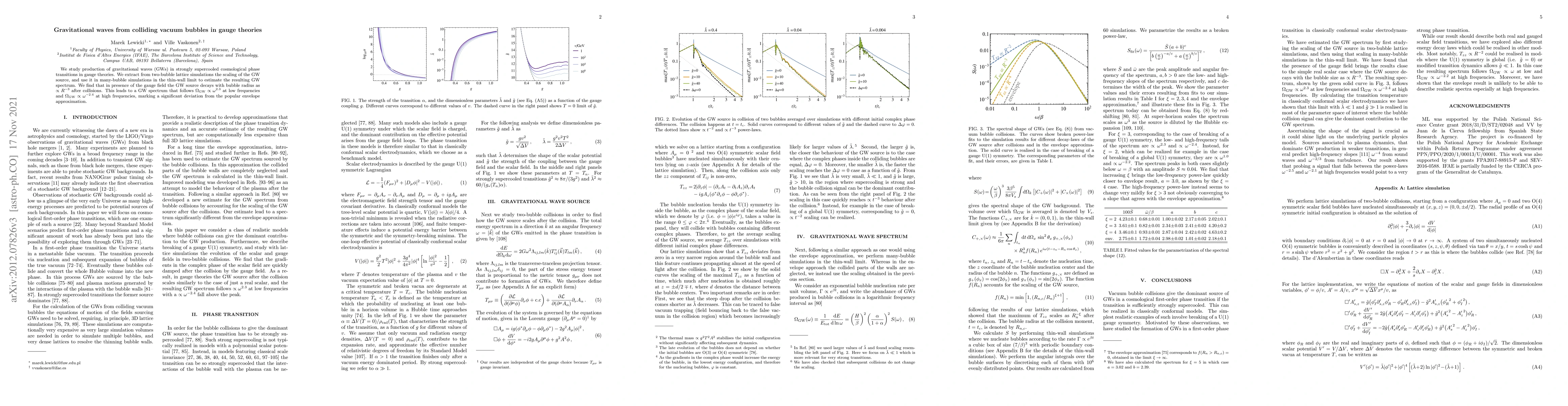 We study production of gravitational waves (GWs) in strongly supercooled cosmological phase transitions in gauge theories. We extract from two-bubble lattice simulations the scaling of the GW source, and use it in many-bubble simulations in the thin-wall limit to estimate the resulting GW spectrum. We find that in presence of the gauge field the GW source decays with bubble radius as $\propto R^{-3}$ after collisions. This leads to a GW spectrum that follows $\Omega_{\rm GW} \propto \omega^{2.3}$ at low frequencies and $\Omega_{\rm GW} \propto \omega^{-2.4}$ at high frequencies, marking a significant deviation from the popular envelope approximation.