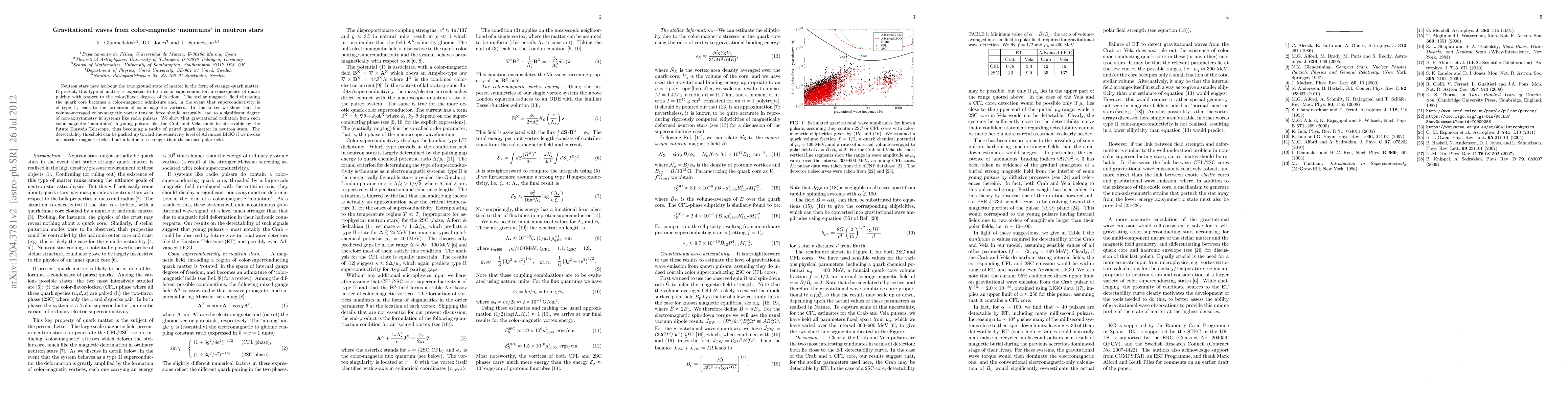 Neutron stars may harbour the true ground state of matter in the form of strange quark matter. If present, this type of matter is expected to be a color superconductor, a consequence of quark pairing with respect to the color/flavor degrees of freedom. The stellar magnetic field threading the quark core becomes a color-magnetic admixture and, in the event that superconductivity is of type II, leads to the formation of color-magnetic vortices. In this Letter we show that the volume-averaged color-magnetic vortex tension force should naturally lead to a significant degree of non-axisymmetry in systems like radio pulsars. We show that gravitational radiation from such color-magnetic `mountains' in young pulsars like the Crab and Vela could be observable by the future Einstein Telescope, thus becoming a probe of paired quark matter in neutron stars. The detectability threshold can be pushed up toward the sensitivity level of Advanced LIGO if we invoke an interior magnetic field about a factor ten stronger than the surface polar field.