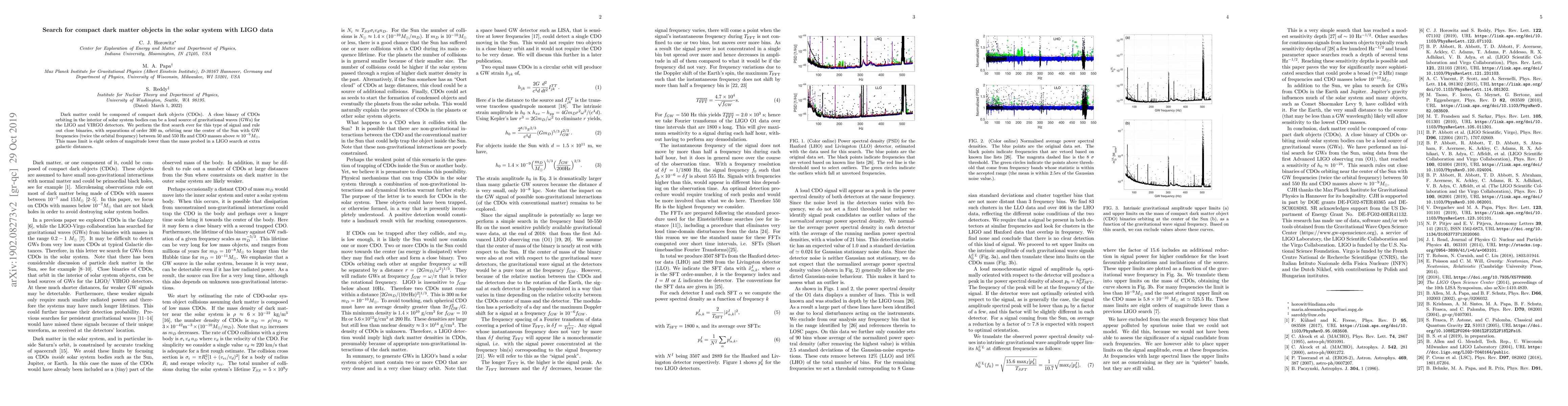 This paper investigates gravitational waves from compact dark matter objects (CDOs) within the solar system, ruling out close binaries of CDOs with separations around 300 m and masses above $10^{-9} M_\odot$ in the Sun's vicinity. The findings set a significant mass limit, eight orders of magnitude lower than previous LIGO searches.