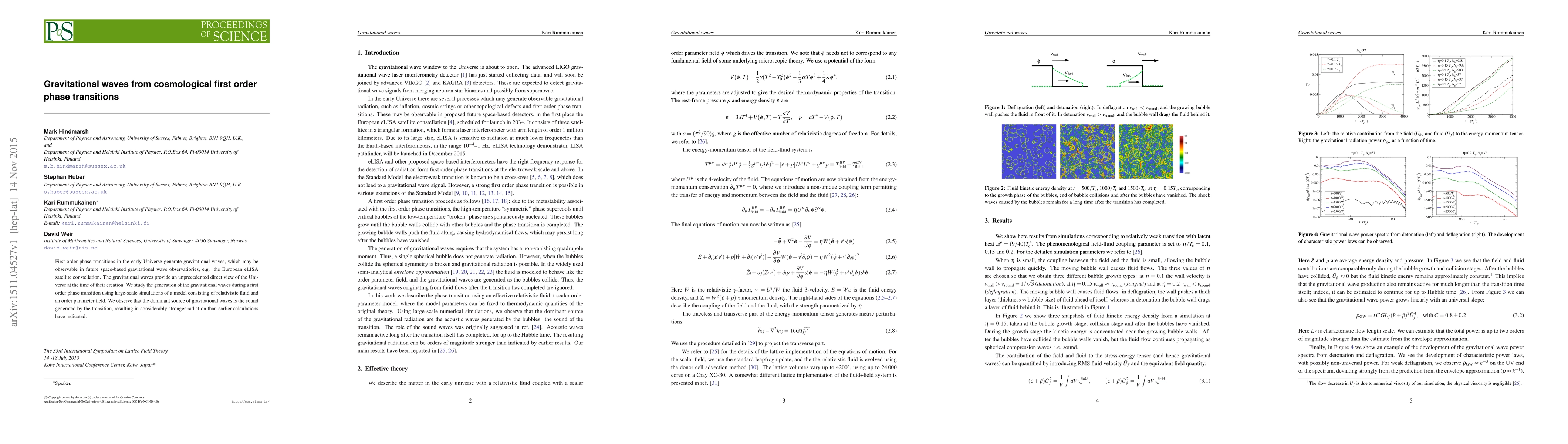 Summary: This paper investigates gravitational waves produced during cosmological first order phase transitions, finding that sound generated by the transition is the dominant source, resulting in stronger radiation than previously calculated. Future space-based observatories like eLISA may detect these waves, offering new insights into the early Universe.