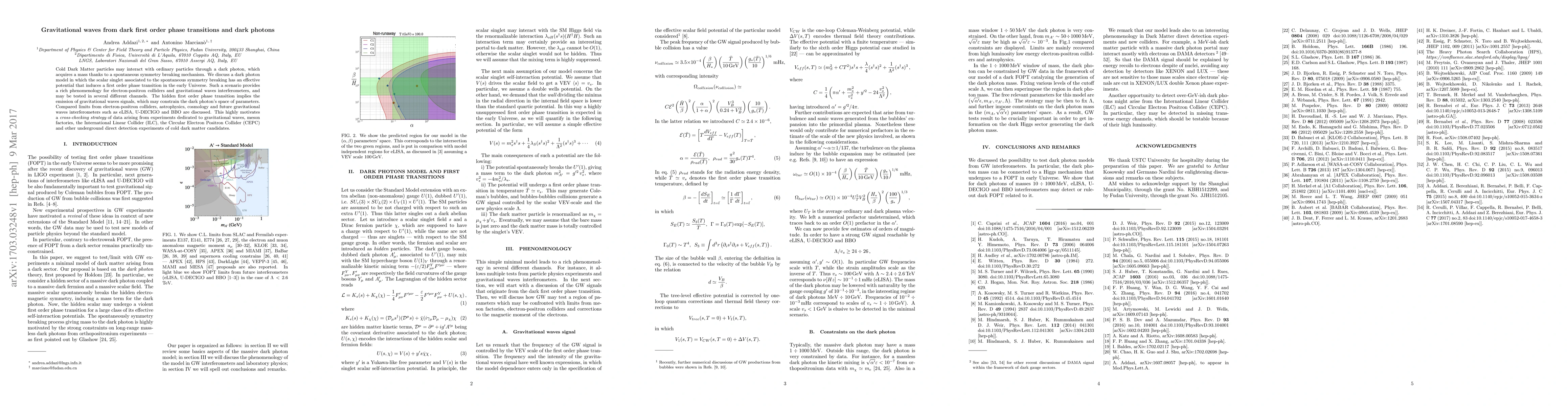 This paper explores a dark photon model where a first order phase transition in the early Universe generates gravitational waves, potentially detectable by future interferometers. The study compares constraints from collider experiments and astrophysics, advocating for a cross-checking strategy using diverse experimental data sources.