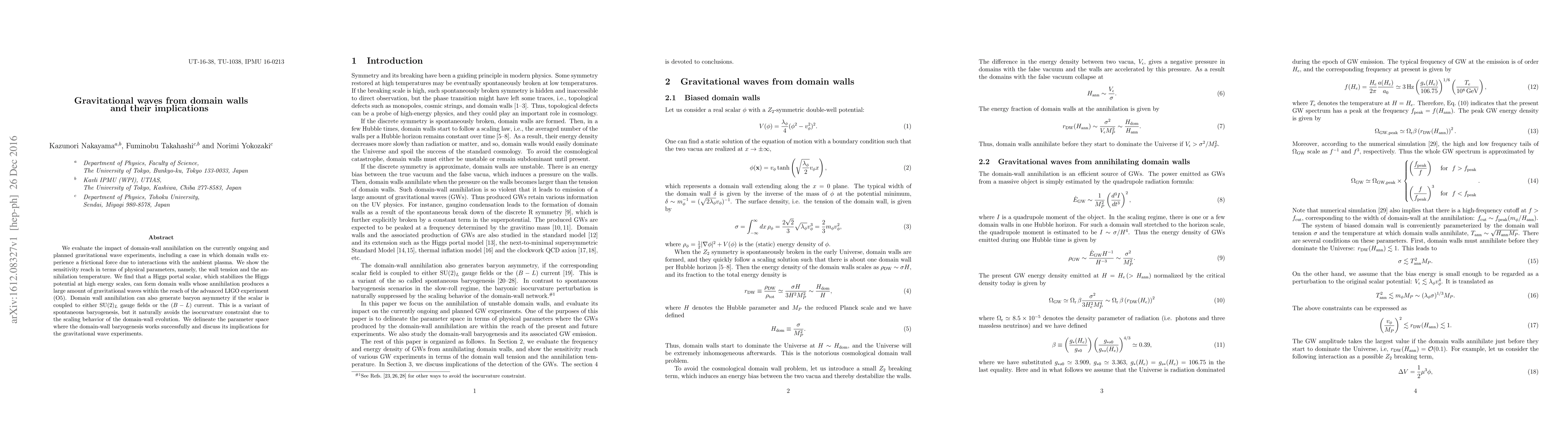We evaluate the impact of domain-wall annihilation on the currently ongoing and planned gravitational wave experiments, including a case in which domain walls experience a frictional force due to interactions with the ambient plasma. We show the sensitivity reach in terms of physical parameters, namely, the wall tension and the annihilation temperature. We find that a Higgs portal scalar, which stabilizes the Higgs potential at high energy scales, can form domain walls whose annihilation produces a large amount of gravitational waves within the reach of the advanced LIGO experiment (O5). Domain wall annihilation can also generate baryon asymmetry if the scalar is coupled to either SU(2)$_L$ gauge fields or the $(B-L)$ current. This is a variant of spontaneous baryogenesis, but it naturally avoids the isocurvature constraint due to the scaling behavior of the domain-wall evolution. We delineate the parameter space where the domain-wall baryogenesis works successfully and discuss its implications for the gravitational wave experiments.