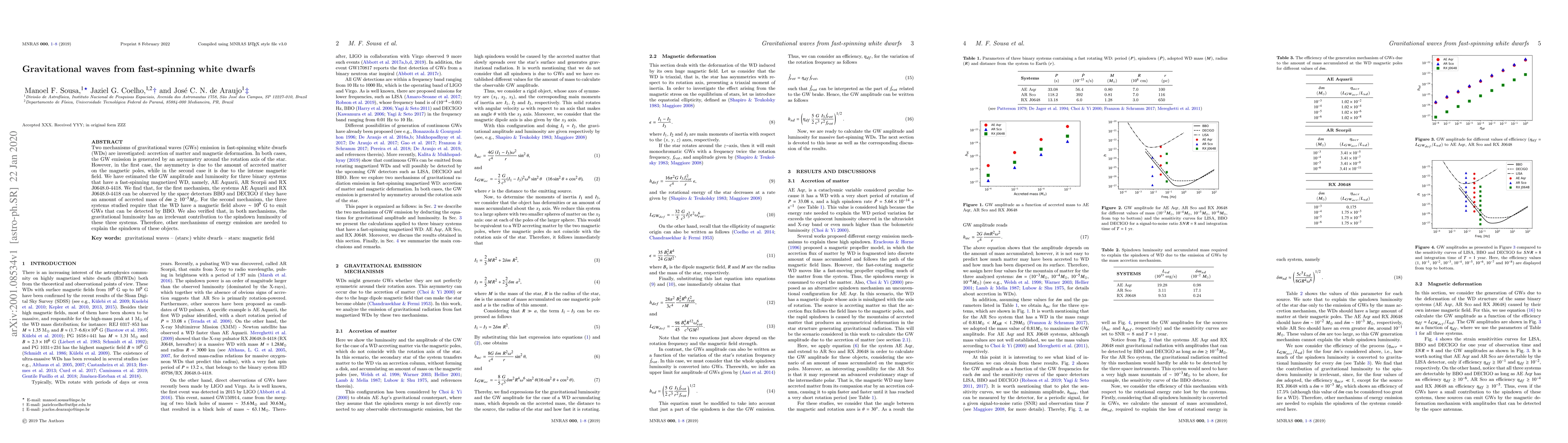 Two mechanisms of gravitational waves (GWs) emission in fast-spinning white dwarfs (WDs) are investigated: accretion of matter and magnetic deformation. In both cases, the GW emission is generated by an asymmetry around the rotation axis of the star. However, in the first case, the asymmetry is due to the amount of accreted matter on the magnetic poles, while in the second case it is due to the intense magnetic field. We have estimated the GW amplitude and luminosity for three binary systems that have a fast-spinning magnetized WD, namely, AE Aquarii, AR Scorpii and RX J0648.0-4418. We find that, for the first mechanism, the systems AE Aquarii and RX J0648.0-4418 can be observed by the space detectors BBO and DECIGO if they have an amount of accreted mass of $\delta m \geq 10^{-5}M_{\odot }$. For the second mechanism, the three systems studied require that the WD have a magnetic field above $\sim 10^{9}$ G to emit GWs that can be detected by BBO. We also verified that, in both mechanisms, the gravitational luminosity has an irrelevant contribution to the spindown luminosity of these three systems. Therefore, other mechanisms of energy emission are needed to explain the spindown of these objects.