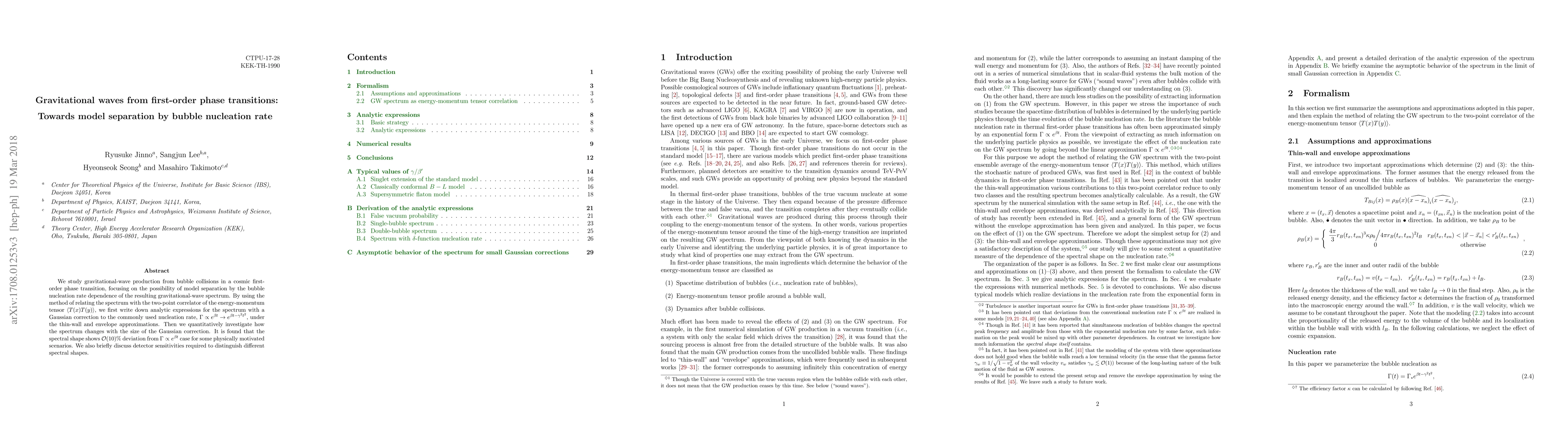We study gravitational-wave production from bubble collisions in a cosmic first-order phase transition, focusing on the possibility of model separation by the bubble nucleation rate dependence of the resulting gravitational-wave spectrum. By using the method of relating the spectrum with the two-point correlator of the energy-momentum tensor $\left< T(x)T(y) \right>$, we first write down analytic expressions for the spectrum with a Gaussian correction to the commonly used nucleation rate, $\Gamma \propto e^{\beta t}\rightarrow e^{\beta t-\gamma^2t^2}$, under the thin-wall and envelope approximations. Then we quantitatively investigate how the spectrum changes with the size of the Gaussian correction. It is found that the spectral shape shows ${\mathcal O}(10)\%$ deviation from $\Gamma \propto e^{\beta t}$ case for some physically motivated scenarios. We also briefly discuss detector sensitivities required to distinguish different spectral shapes.