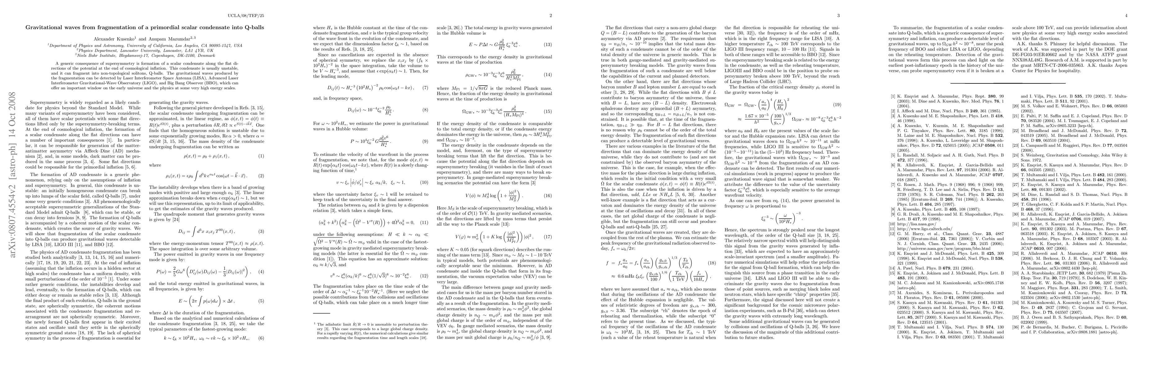 A generic consequence of supersymmetry is formation of a scalar condensate along the flat directions of the potential at the end of cosmological inflation. This condensate is usually unstable, and it can fragment into non-topological solitons, Q-balls. The gravitational waves produced by the fragmentation can be detected by Laser Interferometer Space Antenna (LISA), Advanced Laser Interferometer Gravitational-Wave Observatory (LIGO), and Big Bang Observer (BBO), which can offer an important window on the early universe and the physics at some very high energy scales.