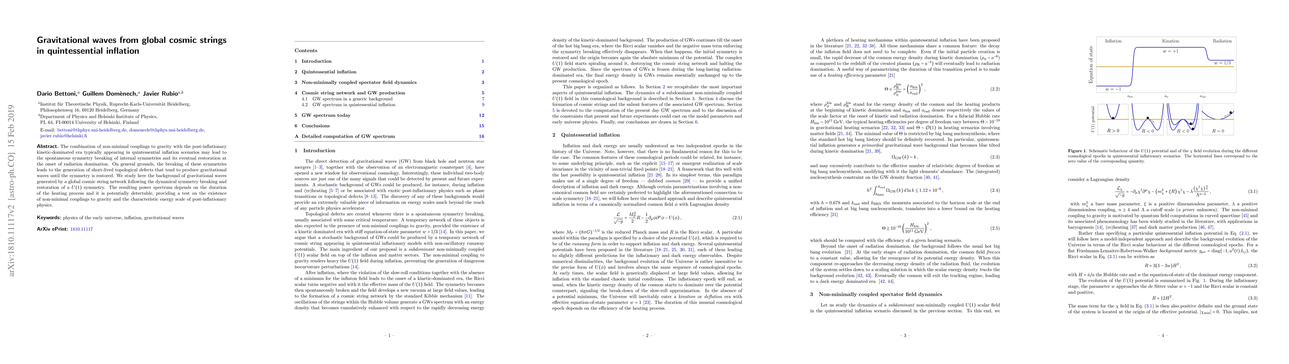 This paper investigates gravitational waves generated by global cosmic strings arising from symmetry breaking in quintessential inflation scenarios. The study highlights how the power spectrum of these waves depends on the heating duration, offering a potential observational test for non-minimal gravity couplings and post-inflationary energy scales.