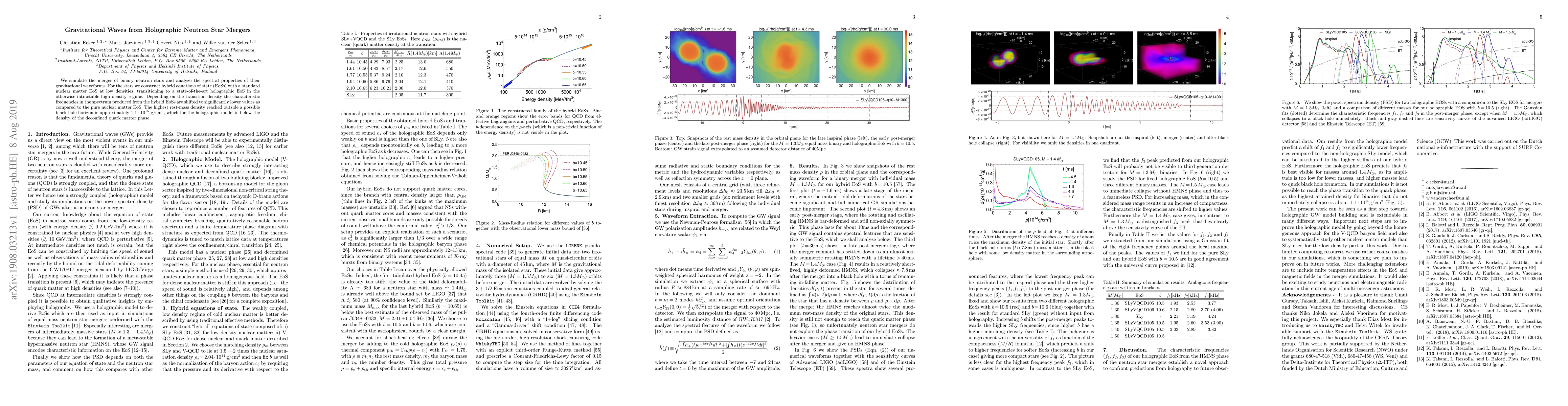 Researchers simulated neutron star mergers using hybrid equations of state that transition from nuclear matter to holographic EoSs, finding significantly lower characteristic frequencies in the gravitational wave spectrum.