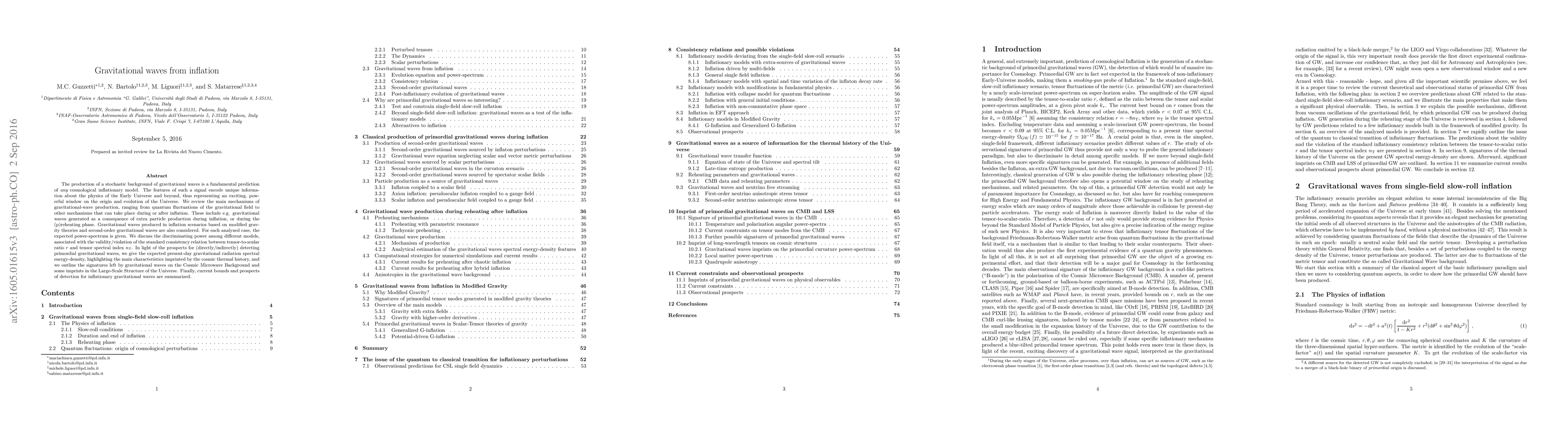 The production of a stochastic background of gravitational waves is a fundamental prediction of any cosmological inflationary model. The features of such a signal encode unique information about the physics of the Early Universe and beyond, thus representing an exciting, powerful window on the origin and evolution of the Universe. We review the main mechanisms of gravitational-wave production, ranging from quantum fluctuations of the gravitational field to other mechanisms that can take place during or after inflation. These include e.g. gravitational waves generated as a consequence of extra particle production during inflation, or during the (p)reheating phase. Gravitational waves produced in inflation scenarios based on modified gravity theories and second-order gravitational waves are also considered. For each analyzed case, the expected power-spectrum is given. We discuss the discriminating power among different models, associated with the validity/violation of the standard consistency relation between tensor-to-scalar ratio $r$ and tensor spectral index $n_{\rm T}$. In light of the prospects for (directly/indirectly) detecting primordial gravitational waves, we give the expected present-day gravitational radiation spectral energy-density, highlighting the main characteristics imprinted by the cosmic thermal history, and we outline the signatures left by gravitational waves on the Cosmic Microwave Background and some imprints in the Large-Scale Structure of the Universe. Finally, current bounds and prospects of detection for inflationary gravitational waves are summarized.