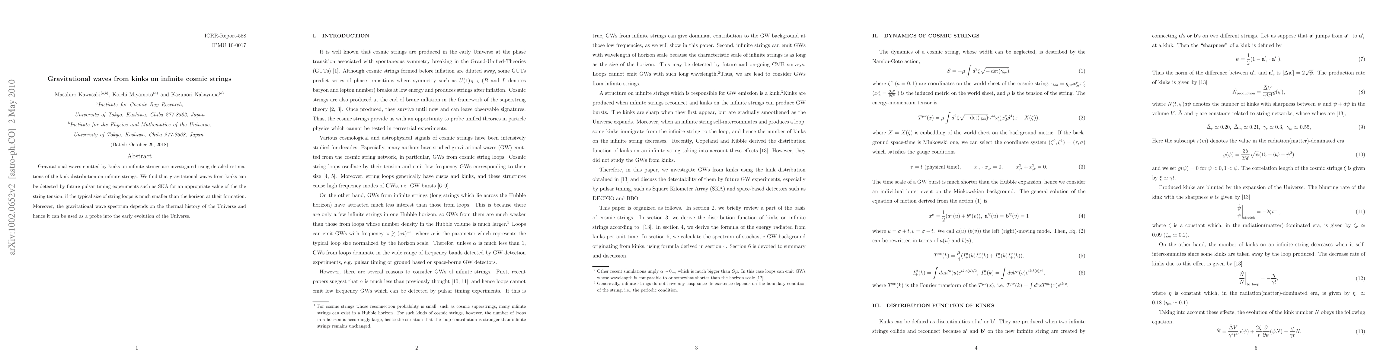 This paper investigates gravitational waves from kinks on infinite cosmic strings, finding they may be detectable by future pulsar timing experiments like SKA under certain conditions. The gravitational wave spectrum also serves as a probe into the early Universe's thermal history.