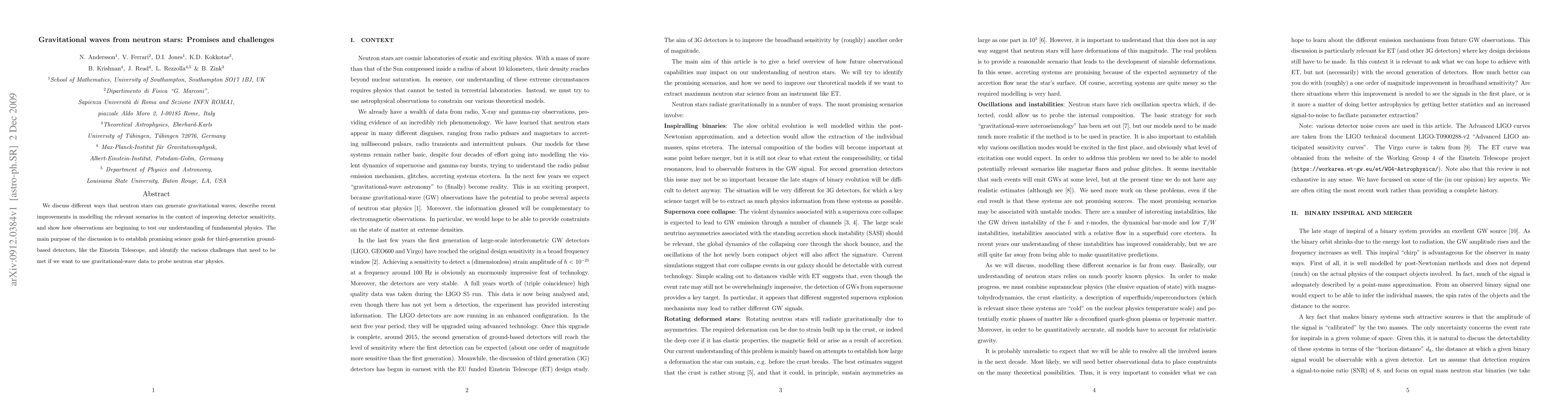 We discuss different ways that neutron stars can generate gravitational waves, describe recent improvements in modelling the relevant scenarios in the context of improving detector sensitivity, and show how observations are beginning to test our understanding of fundamental physics. The main purpose of the discussion is to establish promising science goals for third-generation ground-based detectors, like the Einstein Telescope, and identify the various challenges that need to be met if we want to use gravitational-wave data to probe neutron star physics.