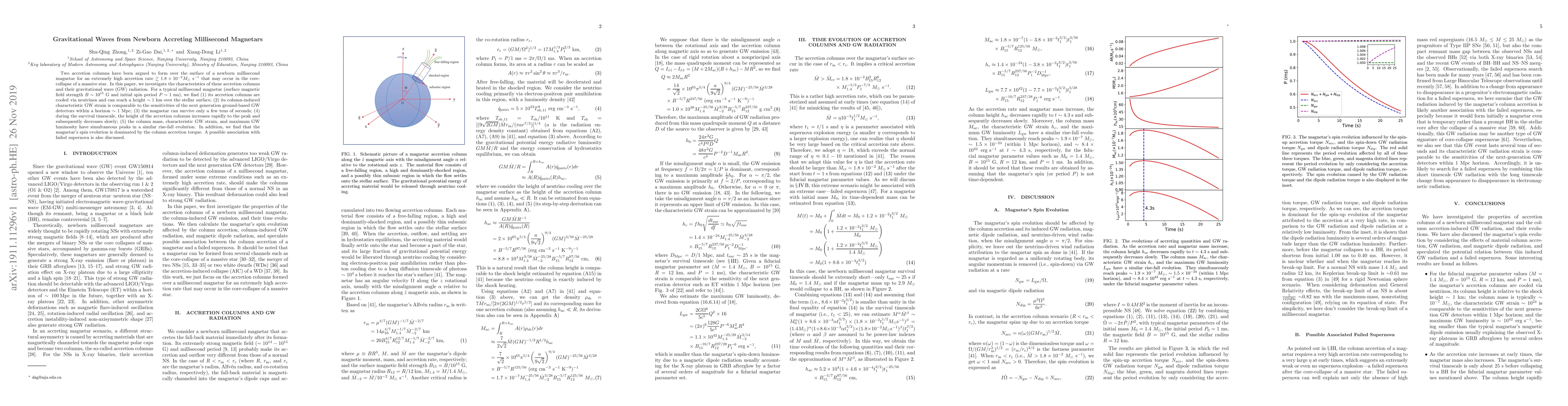 This paper investigates gravitational wave radiation from accretion columns over newborn millisecond magnetars, finding that these columns can reach heights of ~1 km and emit gravitational waves detectable by next-generation ground-based detectors within a 1 Mpc horizon. The magnetar's spin evolution is primarily influenced by the accretion torque from these columns.