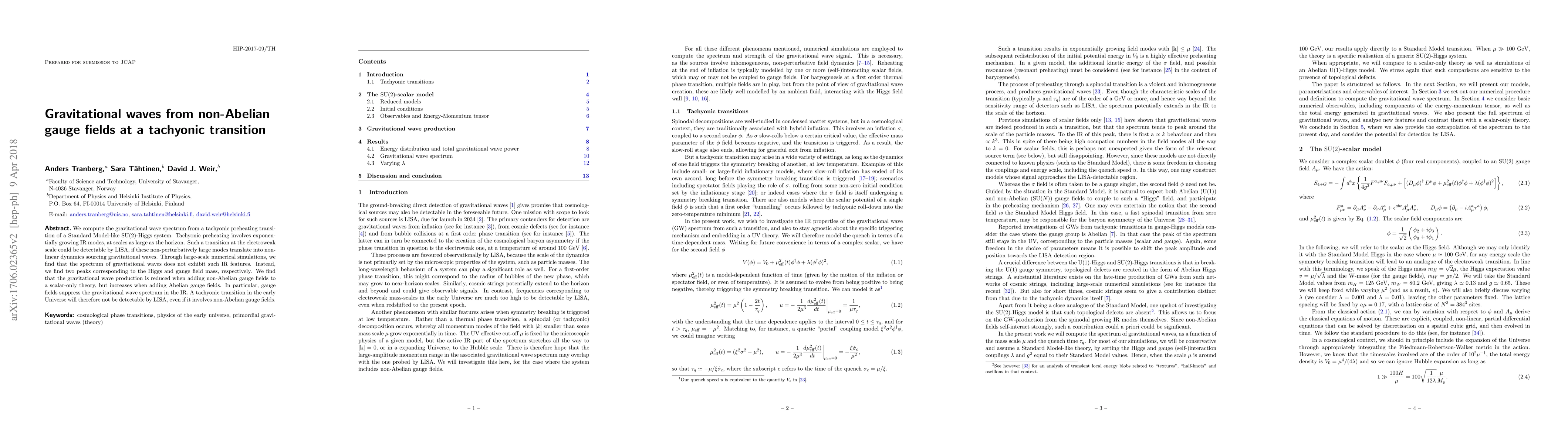 This paper investigates gravitational waves generated during a tachyonic preheating transition in an SU(2)-Higgs system. Despite initial expectations, numerical simulations reveal two peaks in the gravitational wave spectrum corresponding to the Higgs and gauge field masses, with no IR features. The presence of non-Abelian gauge fields reduces gravitational wave production, making such transitions undetectable by LISA.