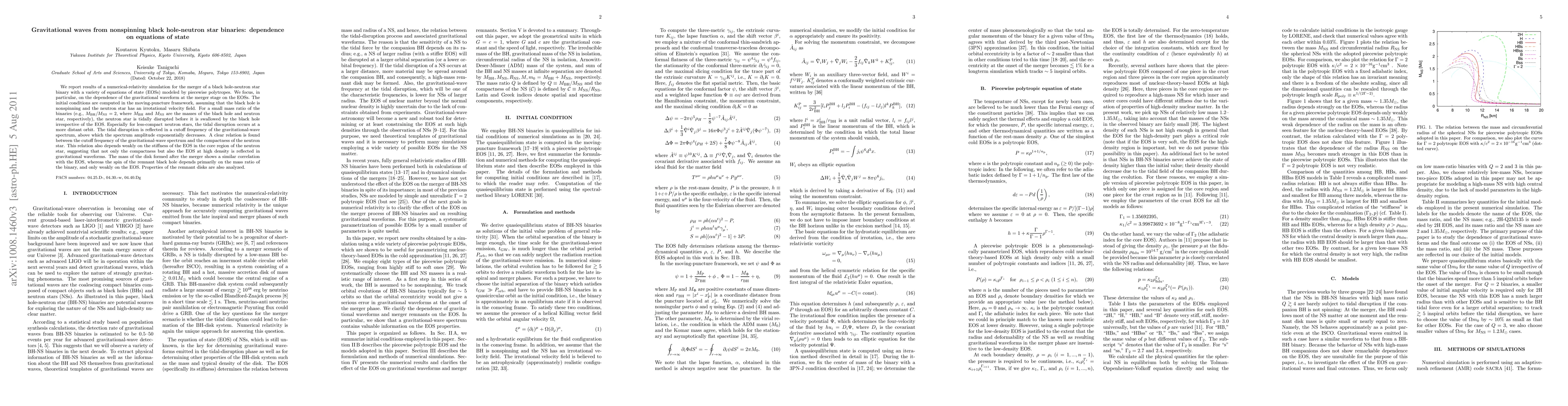We report results of a numerical-relativity simulation for the merger of a black hole-neutron star binary with a variety of equations of state (EOSs) modeled by piecewise polytropes. We focus in particular on the dependence of the gravitational waveform at the merger stage on the EOSs. The initial conditions are computed in the moving-puncture framework, assuming that the black hole is nonspinning and the neutron star has an irrotational velocity field. For a small mass ratio of the binaries (e.g., MBH/MNS = 2 where MBH and MNS are the masses of the black hole and neutron star, respectively), the neutron star is tidally disrupted before it is swallowed by the black hole irrespective of the EOS. Especially for less-compact neutron stars, the tidal disruption occurs at a more distant orbit. The tidal disruption is reflected in a cutoff frequency of the gravitational-wave spectrum, above which the spectrum amplitude exponentially decreases. A clear relation is found between the cutoff frequency of the gravitational-wave spectrum and the compactness of the neutron star. This relation also depends weakly on the stiffness of the EOS in the core region of the neutron star, suggesting that not only the compactness but also the EOS at high density is reflected in gravitational waveforms. The mass of the disk formed after the merger shows a similar correlation with the EOS, whereas the spin of the remnant black hole depends primarily on the mass ratio of the binary, and only weakly on the EOS. Properties of the remnant disks are also analyzed.