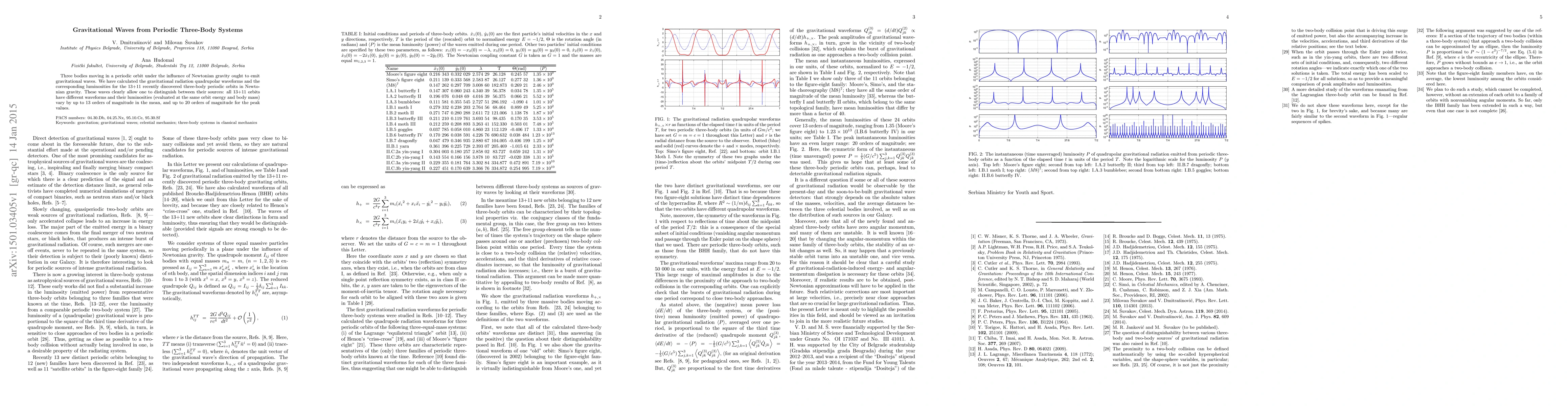 Three bodies moving in a periodic orbit under the influence of Newtonian gravity ought to emit gravitational waves. We have calculated the gravitational radiation quadrupolar waveforms and the corresponding luminosities for the 13+11 recently discovered three-body periodic orbits in Newtonian gravity. These waves clearly allow one to distinguish between their sources: all 13+11 orbits have different waveforms and their luminosities (evaluated at the same orbit energy and body mass) vary by up to 13 orders of magnitude in the mean, and up to 20 orders of magnitude for the peak values.