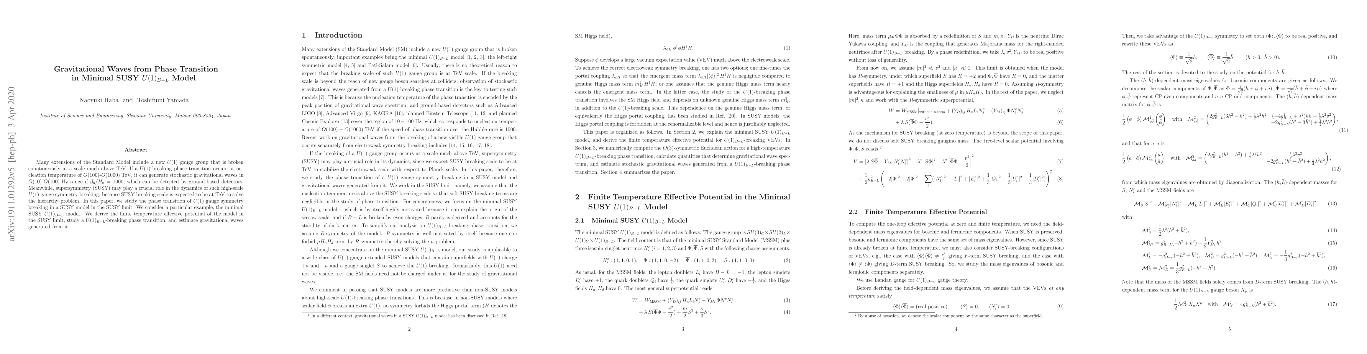 This paper investigates the gravitational waves produced by a spontaneous phase transition in the minimal SUSY $U(1)_{B-L}$ model, where supersymmetry influences the dynamics of high-scale $U(1)$ gauge symmetry breaking. The study estimates the generation of stochastic gravitational waves detectable by ground-based detectors if the phase transition occurs at a temperature range of $O(100)$-$O(1000)$ TeV.