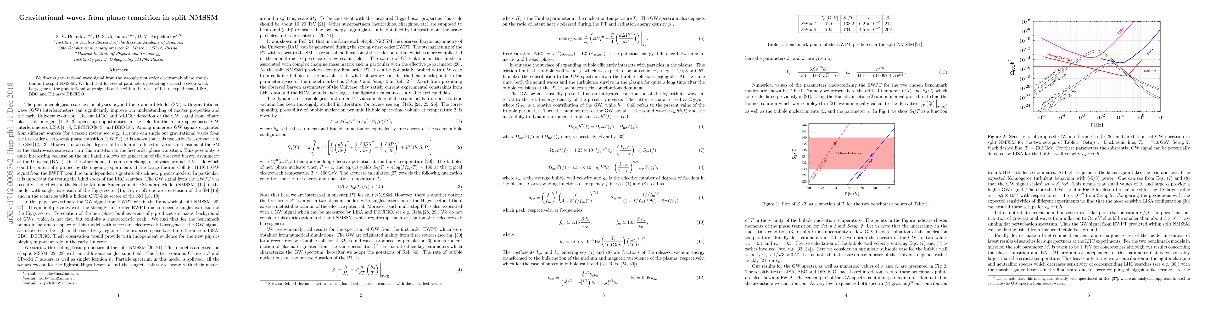 We discuss gravitational wave signal from the strongly first order electroweak phase transition in the split NMSSM. We find that for sets of parameters predicting successful electroweak baryogenesis the gravitational wave signal can be within the reach of future experiments LISA, BBO and Ultimate DECIGO.
