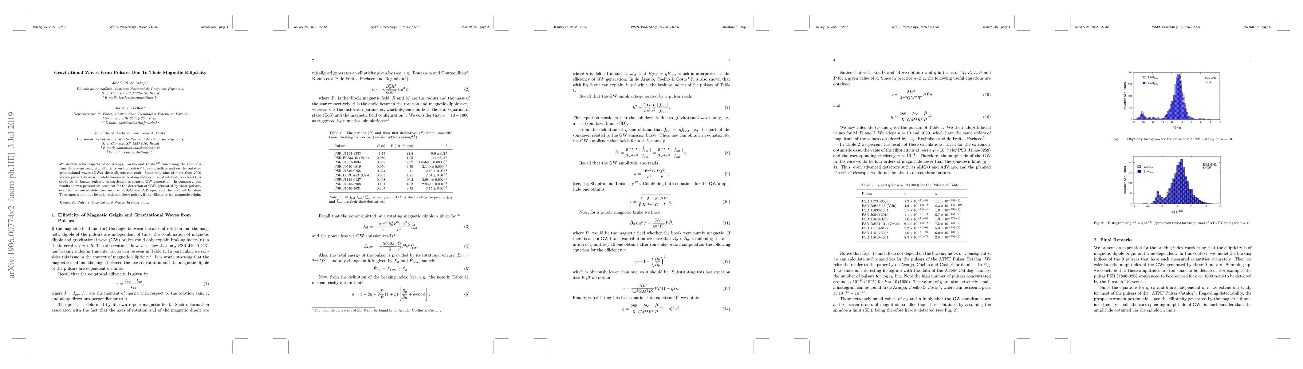 We discuss some aspects of de Araujo, Coelho & Costa (2016, 2017) concerning the role of a time dependent magnetic ellipticity on the pulsars' braking indices and on the putative gravitational waves (GWs) these objects can emit. Since only nine of more than 2000 known pulsars have accurately measured braking indices, it is of interest to extend this study to all known pulsars, in particular as regards GW generation. In summary, our results show a pessimistic prospect for the detection of GWs generated by these pulsars, even for advanced detectors such as aLIGO and AdVirgo, and the planned Einstein Telescope, would not be able to detect these pulsar, if the ellipticity has magnetic origin.