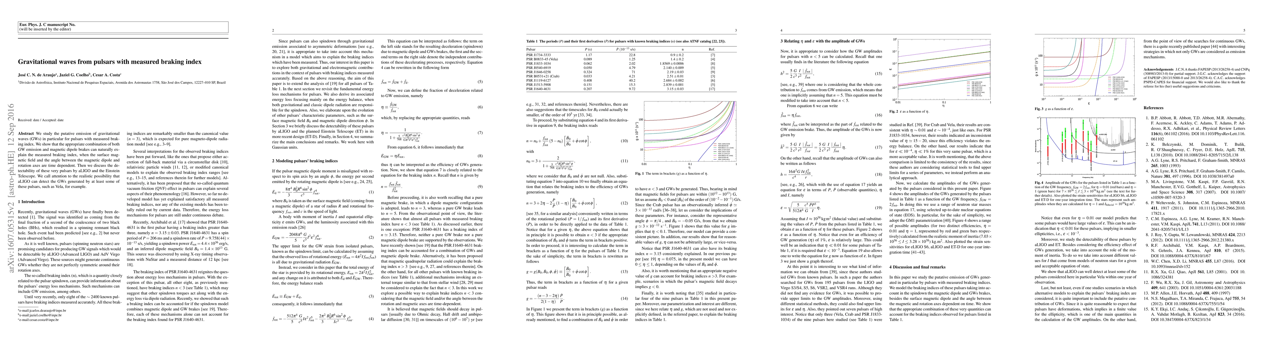 This paper investigates gravitational wave (GW) emissions from pulsars with a measured braking index, demonstrating how GWs and magnetic dipole brakes can jointly explain the braking index through time-dependent magnetic fields and axis angles. It also highlights the potential for aLIGO and the Einstein Telescope to detect GWs from specific pulsars like Vela.
