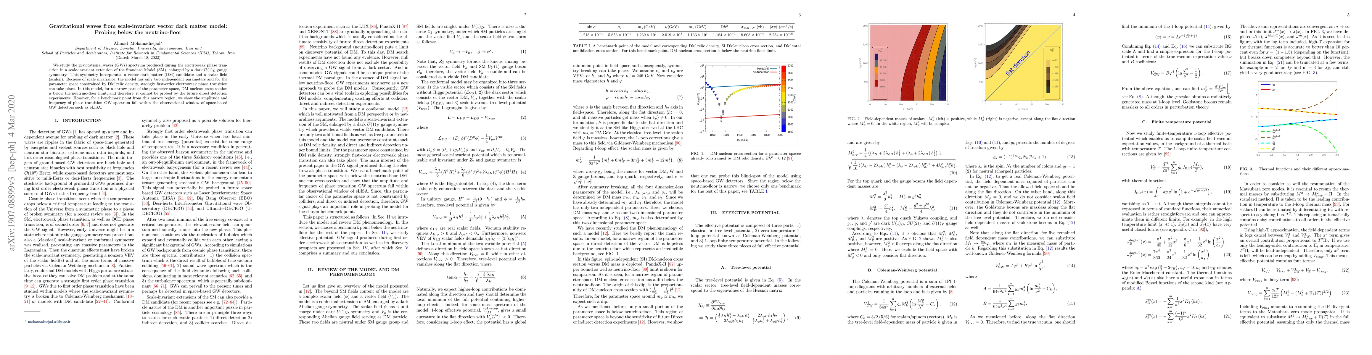We study the gravitational waves (GWs) spectrum produced during the electroweak phase transition in a scale-invariant extension of the Standard Model (SM), enlarged by a dark $ U(1)_{D} $ gauge symmetry. This symmetry incorporates a vector dark matter (DM) candidate and a scalar field (scalon). Because of scale invariance, the model has only two independent parameters and for the parameter space constrained by DM relic density, strongly first-order electroweak phase transition can take place. In this model, for a narrow part of the parameter space, DM-nucleon cross section is below the neutrino-floor limit, and therefore, it cannot be probed by the future direct detection experiments. However, for a benchmark point form this narrow region, we show the amplitude and frequency of phase transition GW spectrum fall within the observational window of space-based GW detectors such as eLISA.