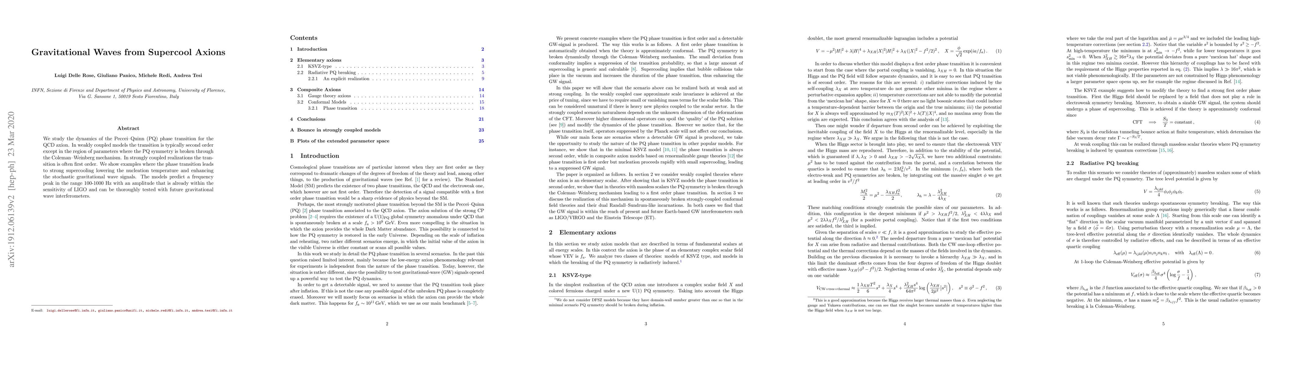 We study the dynamics of the Peccei-Quinn (PQ) phase transition for the QCD axion. In weakly coupled models the transition is typically second order except in the region of parameters where the PQ symmetry is broken through the Coleman-Weinberg mechanism. In strongly coupled realizations the transition is often first order. We show examples where the phase transition leads to strong supercooling lowering the nucleation temperature and enhancing the stochastic gravitational wave signals. The models predict a frequency peak in the range 100-1000 Hz with an amplitude that is already within the sensitivity of LIGO and can be thoroughly tested with future gravitational wave interferometers.