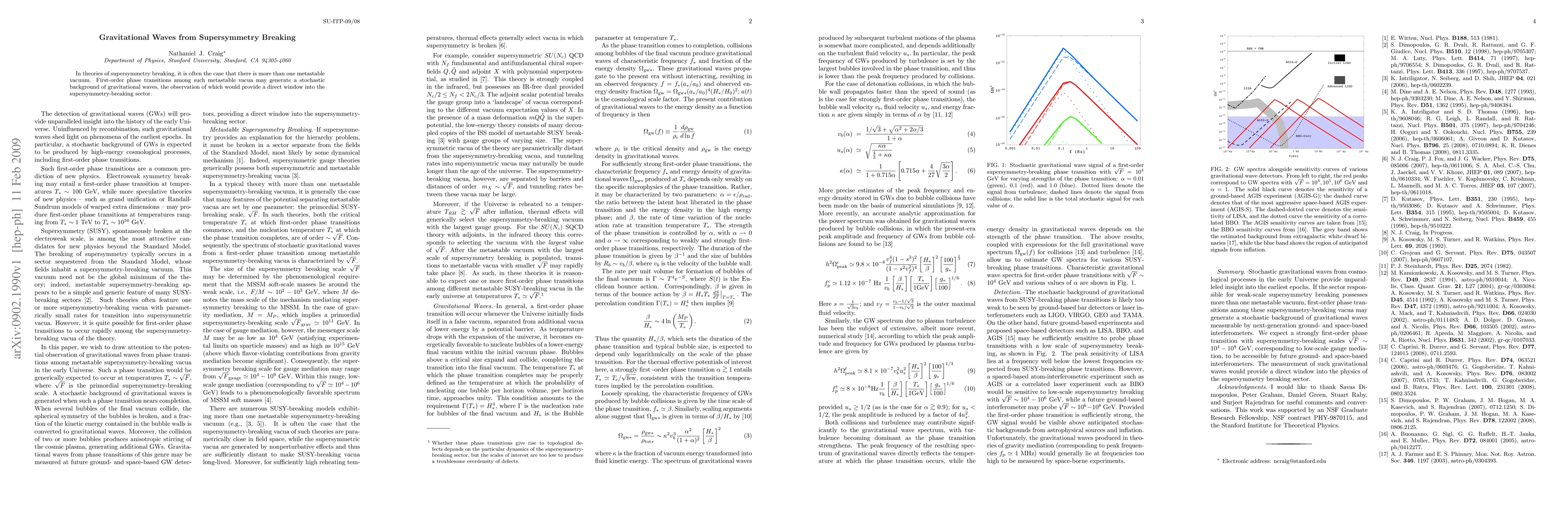 Summary: This paper investigates how first-order phase transitions between metastable vacua in supersymmetry-breaking theories could produce a gravitational wave background, offering a potential observational probe into the mechanisms of supersymmetry breaking.