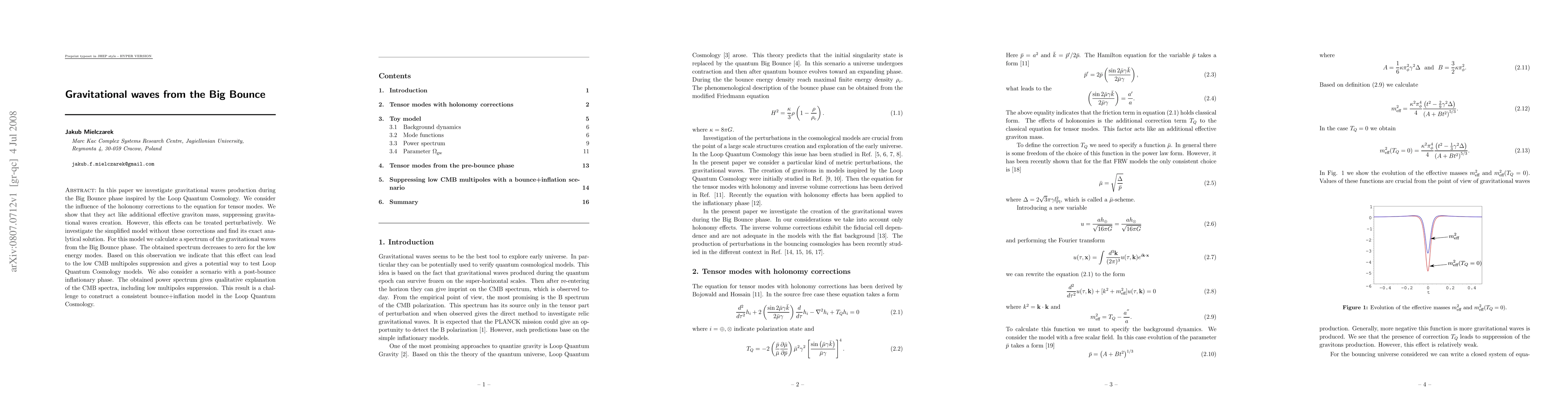 This paper explores gravitational wave production during the Big Bounce phase in Loop Quantum Cosmology, showing that holonomy corrections suppress wave creation. It presents an analytical solution for a simplified model, revealing a spectrum that decreases for low energy modes, potentially explaining low CMB multipoles suppression and offering a test for Loop Quantum Cosmology models.