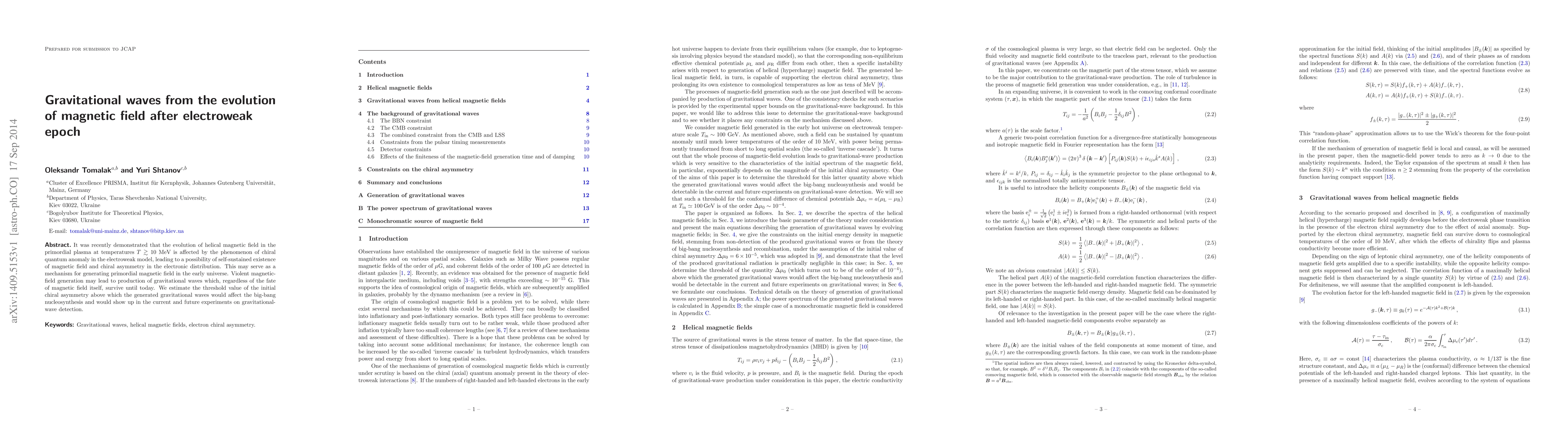 This paper explores how the evolution of helical magnetic fields in primordial plasma, influenced by the chiral quantum anomaly, could generate primordial magnetic fields and potentially produce gravitational waves. The study estimates the initial chiral asymmetry threshold for these gravitational waves to impact big-bang nucleosynthesis and be detectable in current and future gravitational-wave experiments.