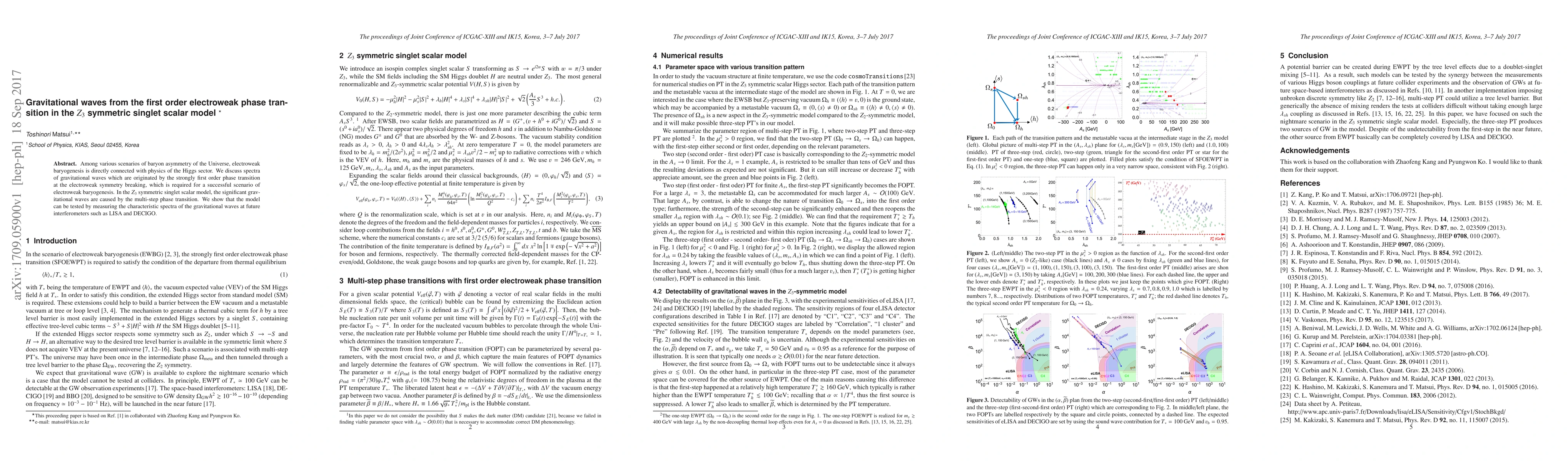 Among various scenarios of baryon asymmetry of the Universe, electroweak baryogenesis is directly connected with physics of the Higgs sector. We discuss spectra of gravitational waves which are originated by the strongly first order phase transition at the electroweak symmetry breaking, which is required for a successful scenario of electroweak baryogenesis. In the $Z_3$ symmetric singlet scalar model, the significant gravitational waves are caused by the multi-step phase transition. We show that the model can be tested by measuring the characteristic spectra of the gravitational waves at future interferometers such as LISA and DECIGO.