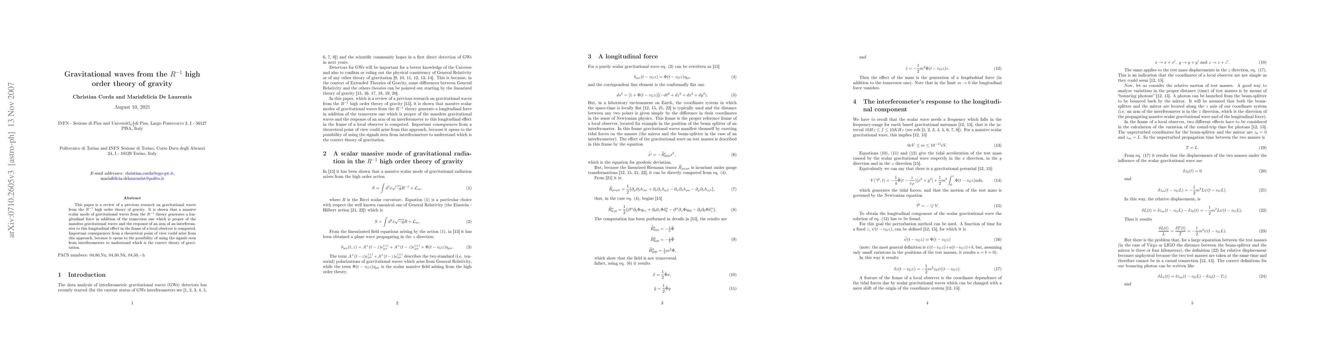 This paper reviews gravitational waves from the R^-1 high order theory of gravity, showing that it generates both longitudinal and transverse forces, unlike traditional massless gravitational waves. The study computes the interferometer response to these effects, potentially aiding in determining the correct gravitational theory.